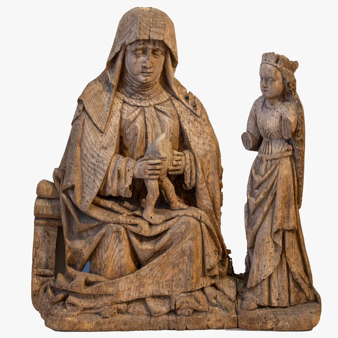 Anna sidder på en bænk med Jesusbarnet, som hun holder op foran sig. Jesusbarnet er nøgent. Til venstre for Anna står Maria med krone på hovedet.
