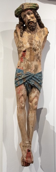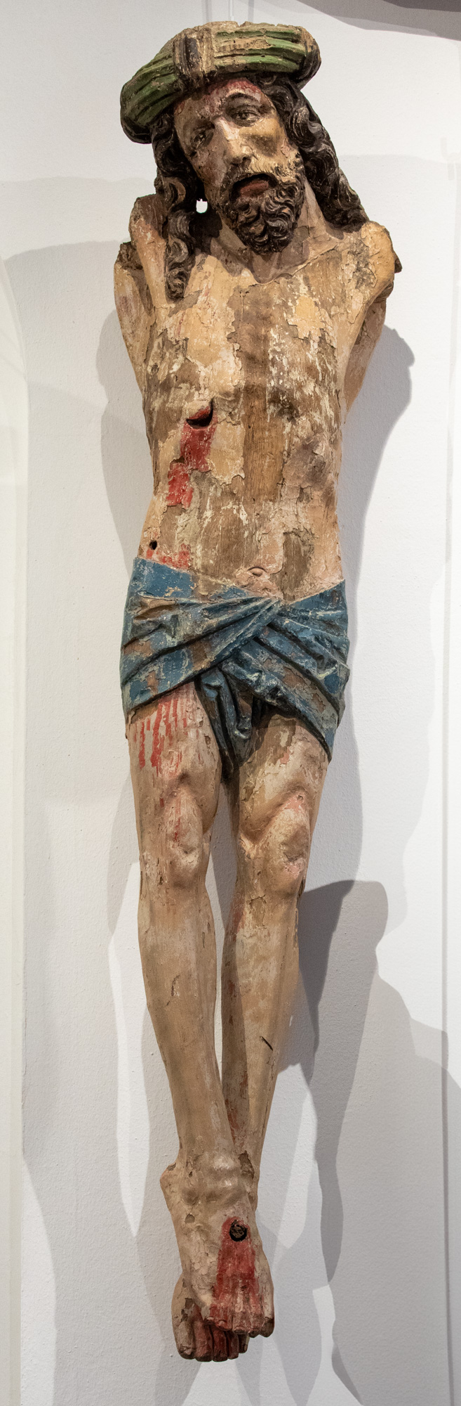 Hovedet hælder mod højre. Tornekronen er stor med omviklinger. Sidesåret er dybt og halvcirkelformet. Lændeklædet er bundet midt for. Der er spor af en endeflig, der har stået ud i en stor bue, men den er nu borte. Højre fod er lagt ind over venstre.