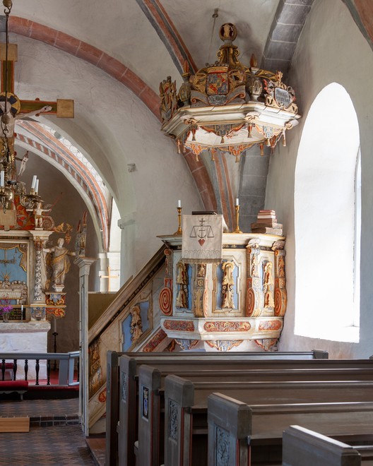 Den nuværende prædikesstol og lydhimmel er udført af Johan Ullberg, 1752.
