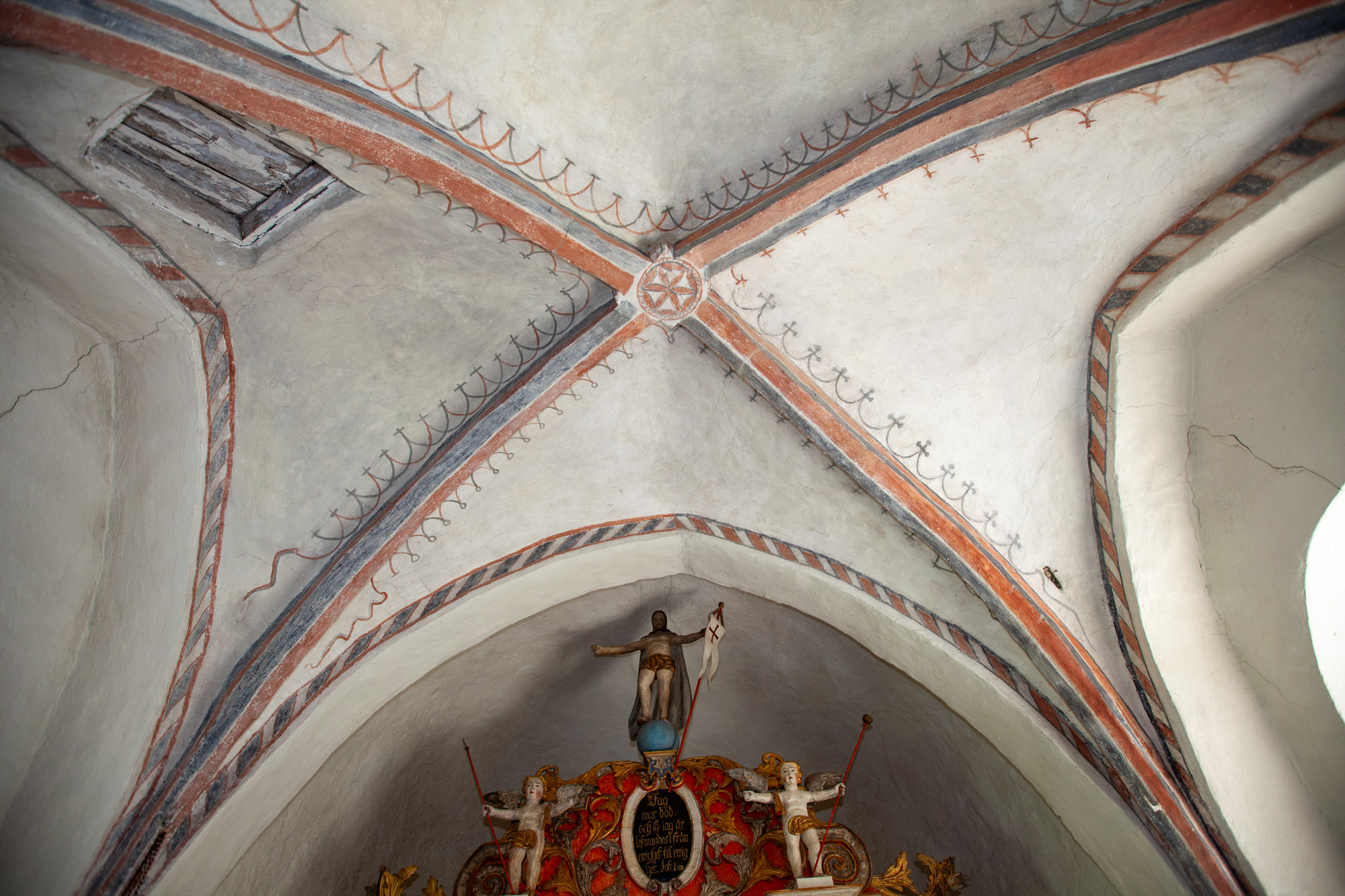 Bag den nyere bemaling er der rester af den oprindelige staffering.