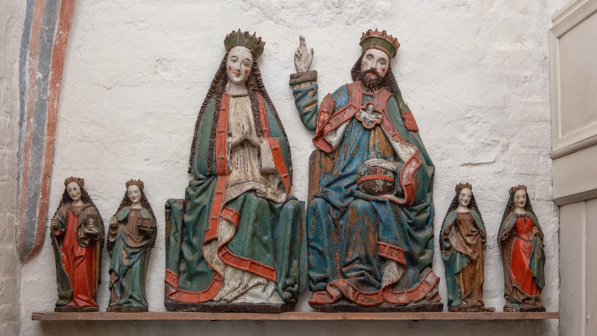 Kristus og Maria i stor størrelse og fire mindre kvindelige helgener. Kristus sidder frontalt med højre hånd løftet til velsignelse, og i venstre hånd holder han jordkloden. På hovedet bærer han en krone. Han er iklædt kjortel og en kappe, som er holdt sammen af et stort firpasformet spænde på brystet. Spændet har et billede af en engel.