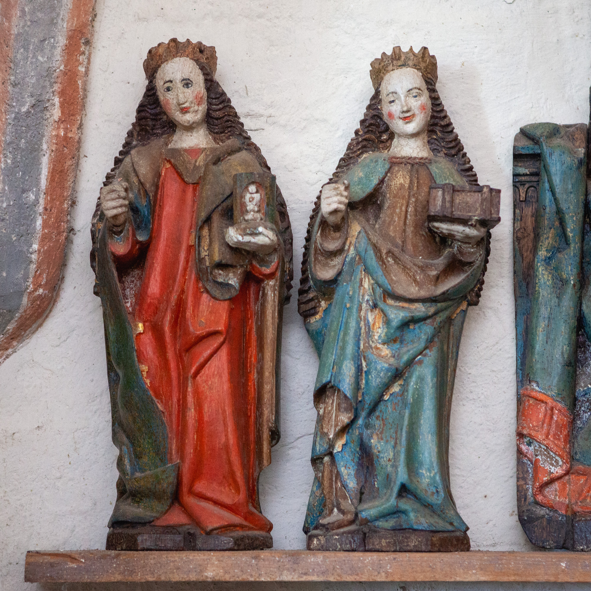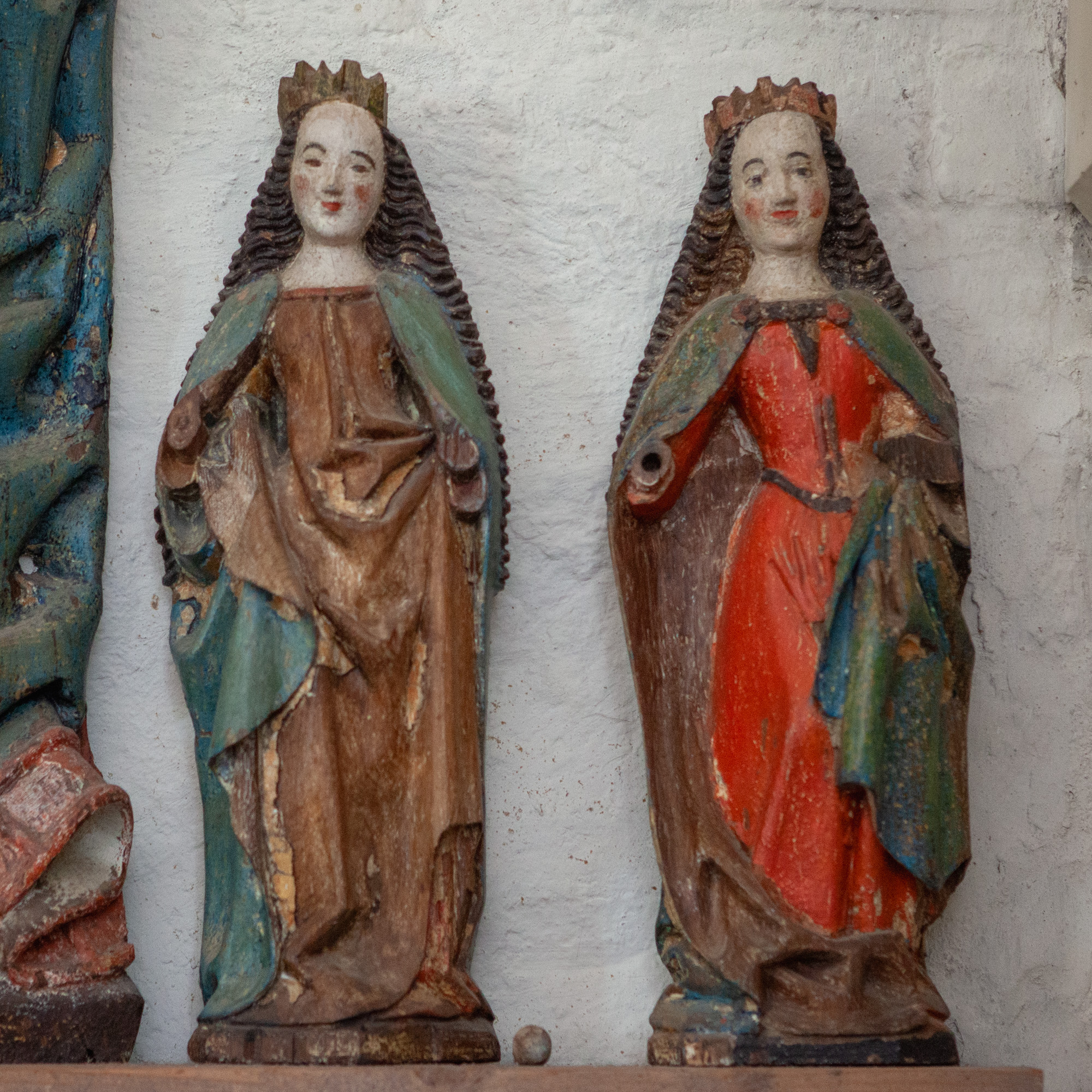 De mindre helgenfigurer er alle stående. Maria Magdalene bærer sin salvelseskrukke, og Margaretha har en lukket bog. De to andre har mistet deres attributter.