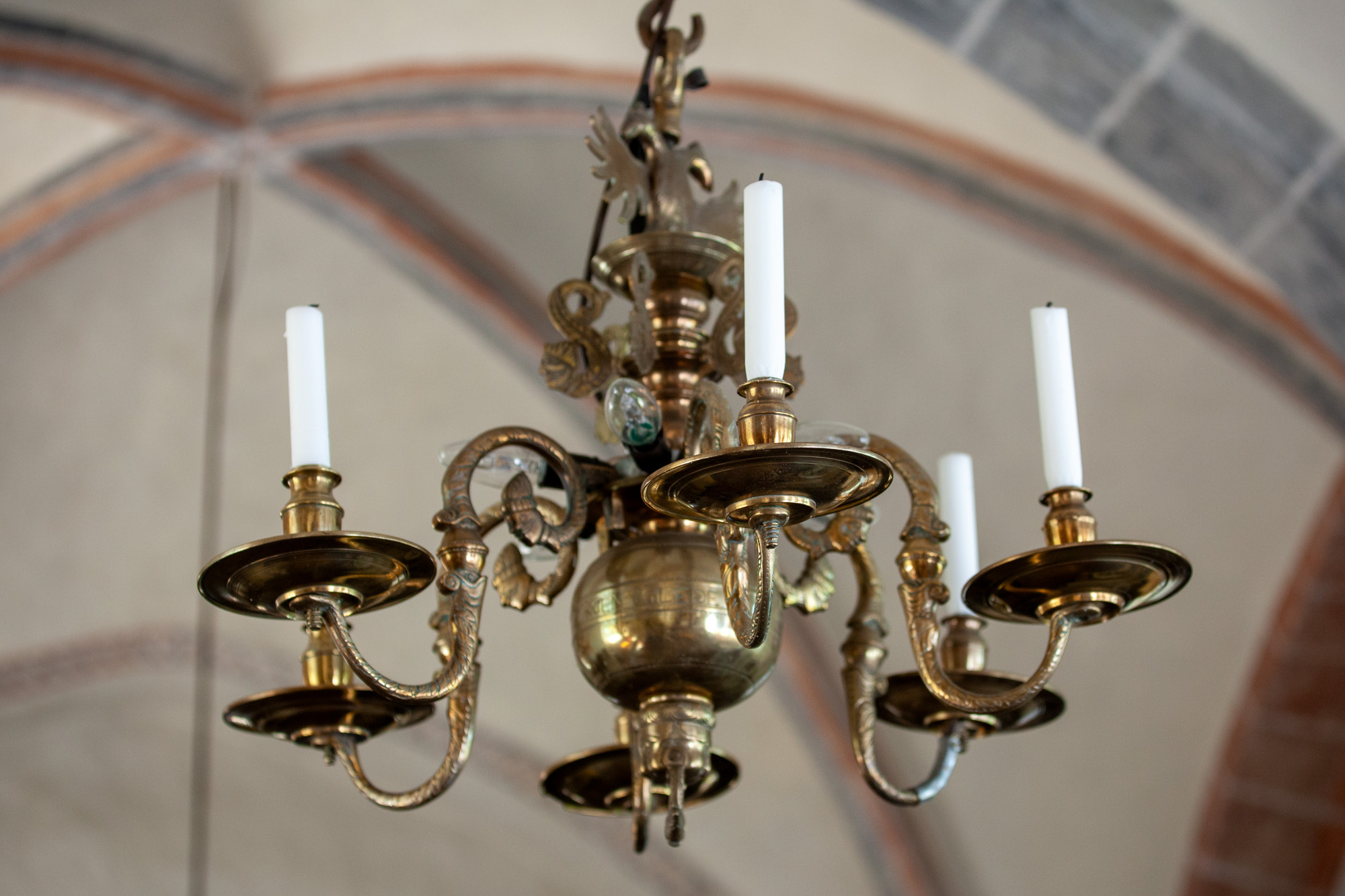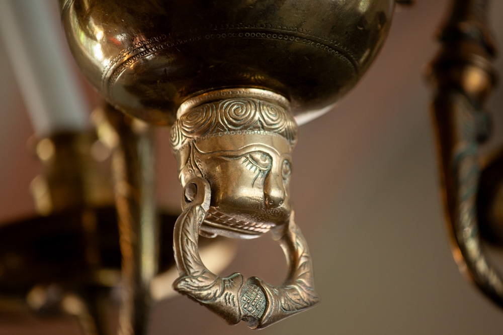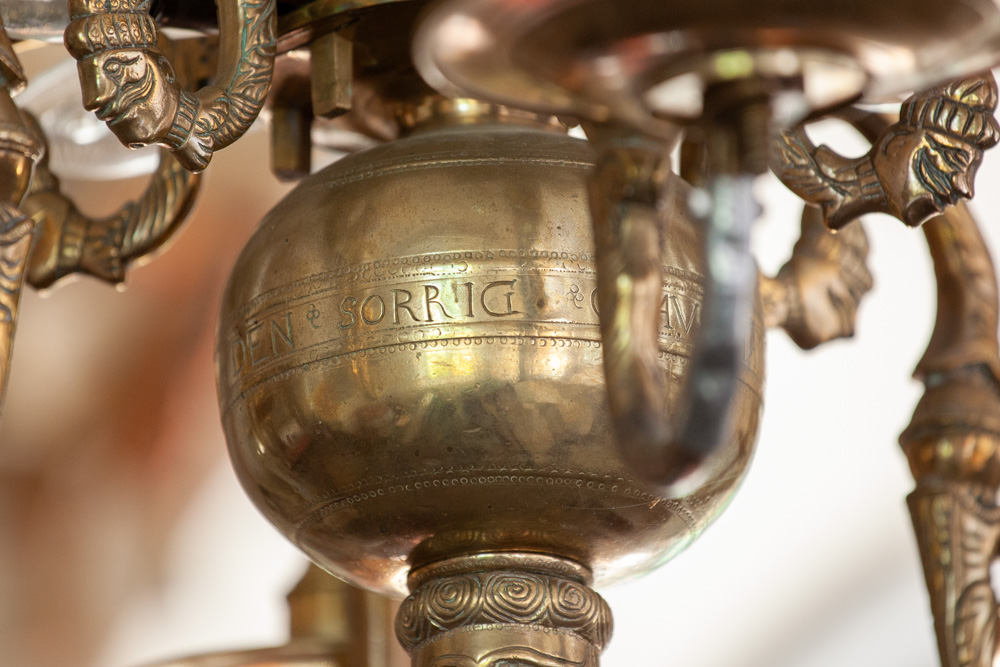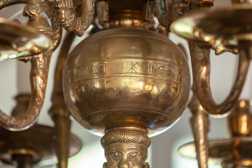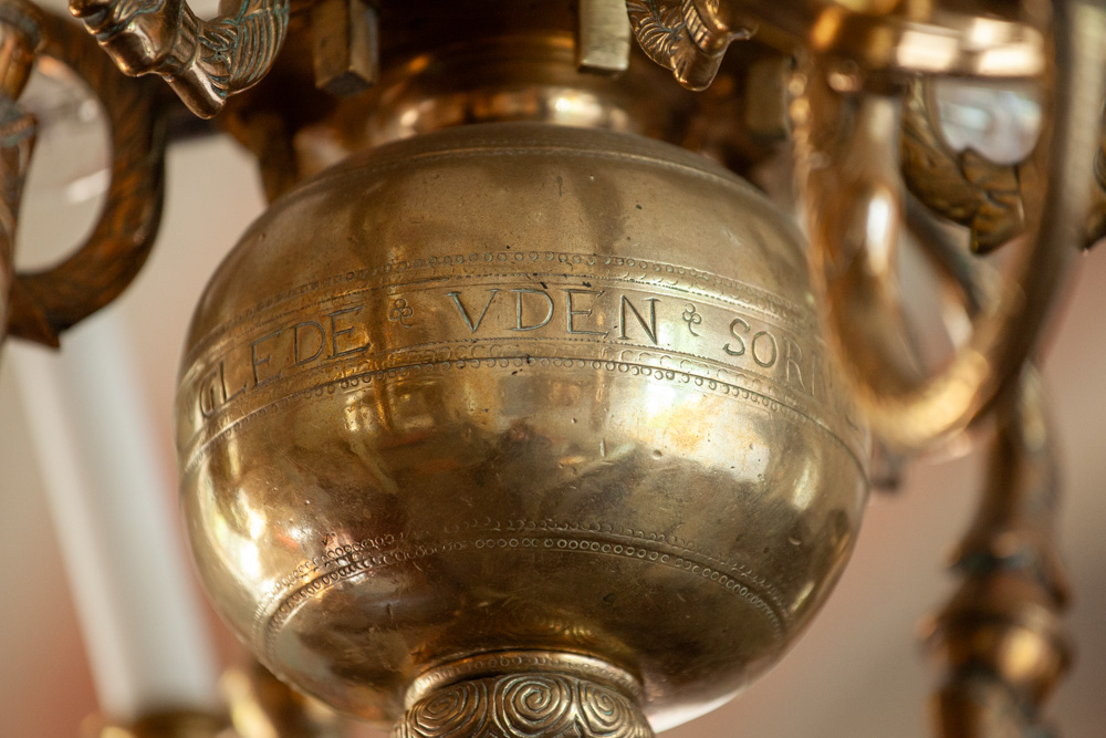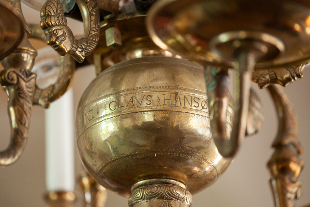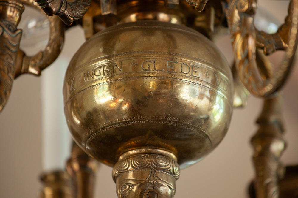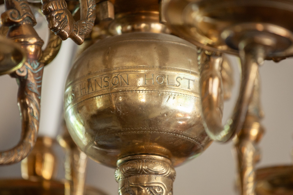 En lysekrone af malm er fra midten af 1600-tallet. Den bærer en indskrift: