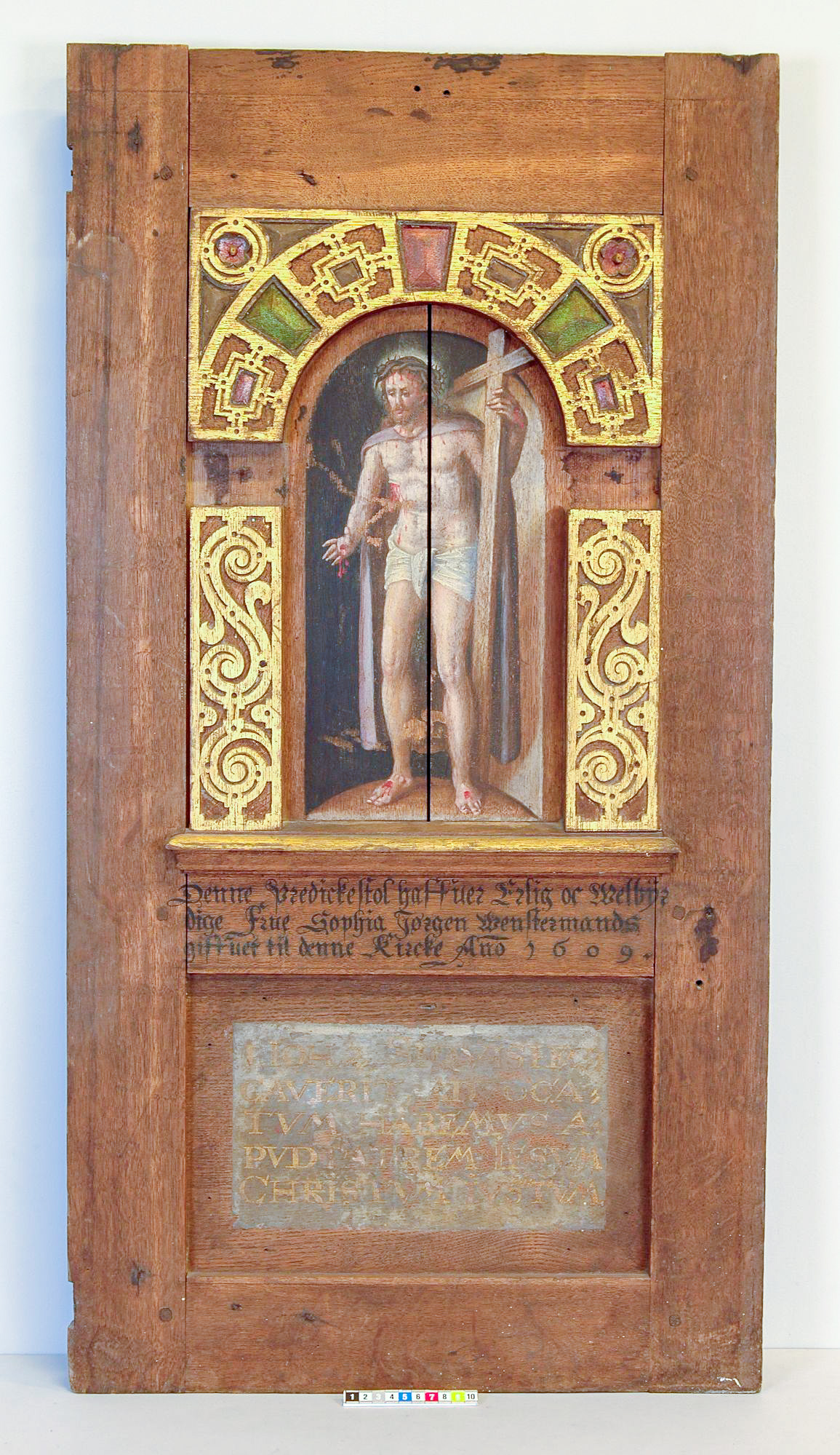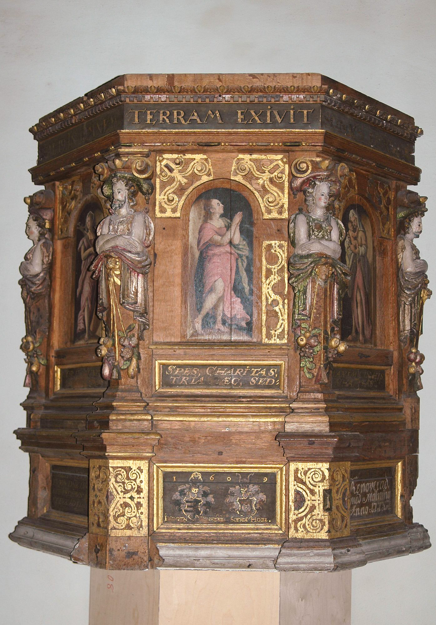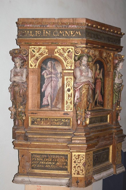 Denne predickestol haffuer Erlig oc Welbÿrdige Frue Sophia Jørgen Wenstermands giffuet til denne Kircke Ano 1609.