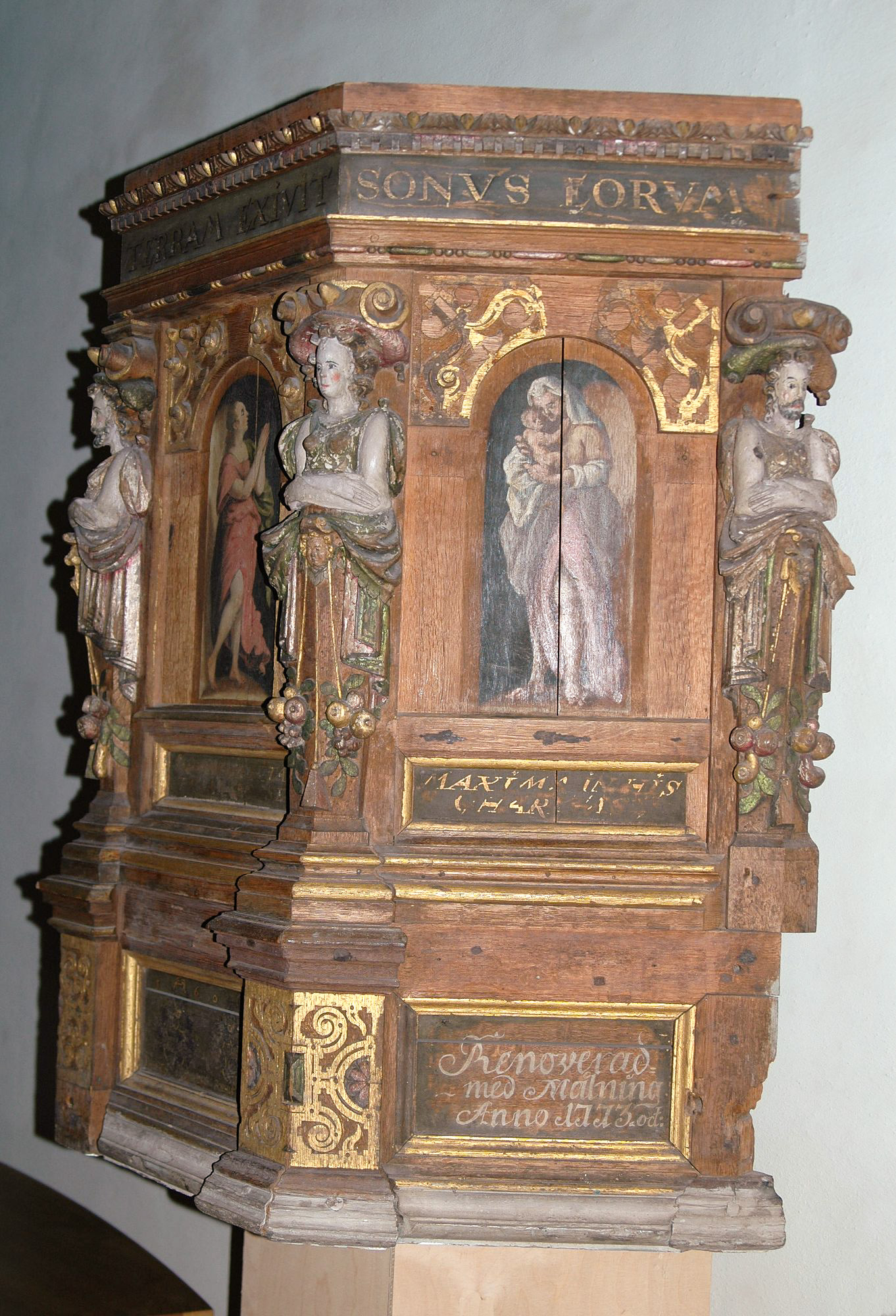 Kirkens gamle prædikestol med fire sider fra 1609, som nu opbevares på Statens Historiska Museum, Stockholm.