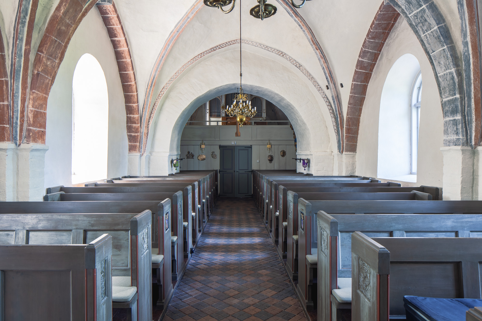 Storfelterne har arkader med fremstillinger af de tre hoveddyder Tro, Håb og Kærlighed. Arkaderne har beslagornamentik med diamanter i sviklerne. Et fjerde felt stammer formodentlig fra en dør. Det adskiller sig fra de tre andre med en anden ornamentik.