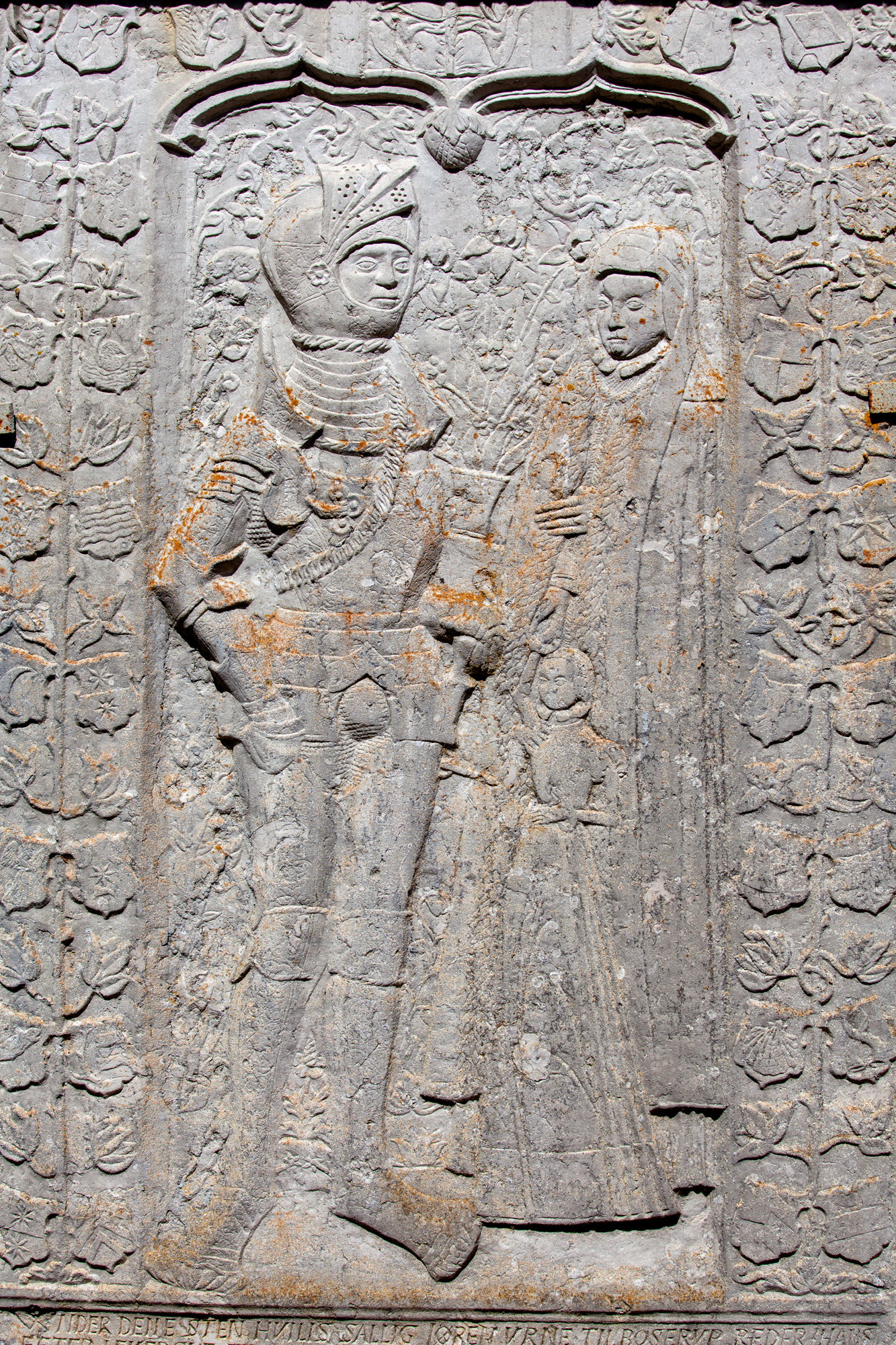 På stenen er de tre figurer samt 2 gange 16 aner, hvoraf de fire er hjelmede. Over arkadens kølbuer er et treenighedsrelief. Anevåbnene er anbragt på en stilk skiftevis med blade. Kristi stamtræ, Jessetræet, har været forbillede.