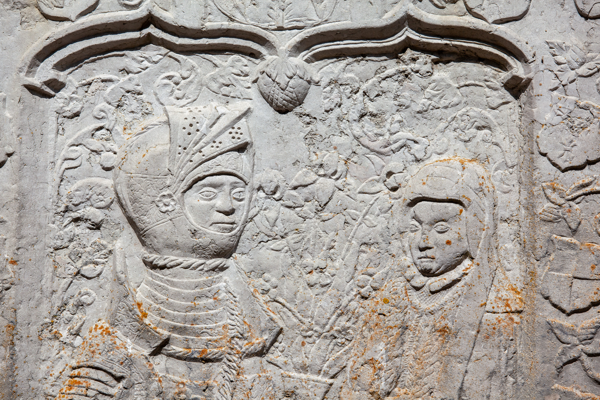 Under dyderne findes et tekstfelt, hvor man i det ene kan læse navnene Spes og Charitas. Storfelterne adskilles af hermer skiftevis mandlige og kvindelige. Over hovedet ligger en pude, som en volutkapitæl hviler på. De mandlige hermer har en løvemaske og de kvindelige en englemaske på underkroppen. Under dem hænger frugtklaser. De står på rigt profilerede fremspring.