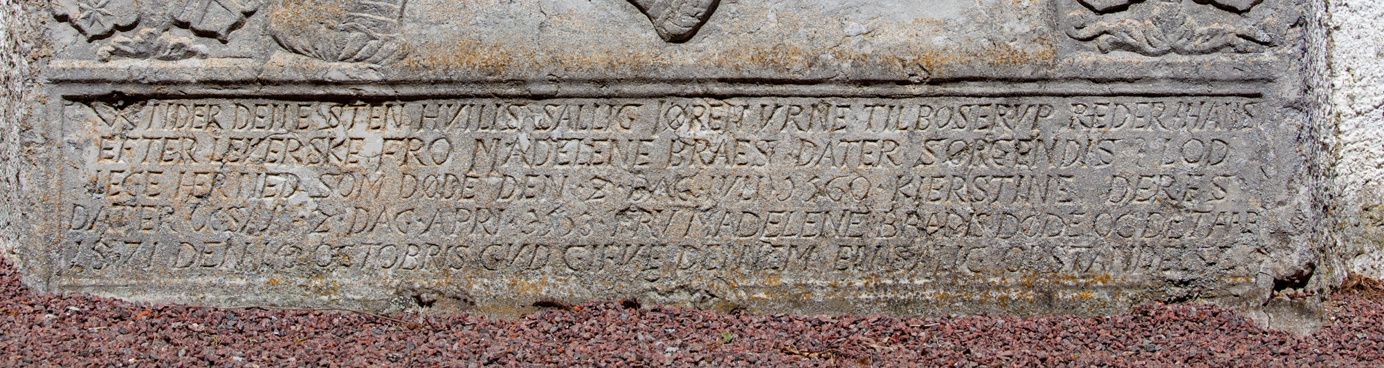 Under denne sten hvilis salig Jøren Urne til Boserup Reder, hans efterleverske Fro Madelene Braesdater sørgendis lod lege herned som døde den 2. juli 1560. Kierstine deres dater oc saa 2. april 1553 Fru Madelene Braes døde oc det aar 1571 den 14 octobris. Gud gifve dennem en salig opstandelse.