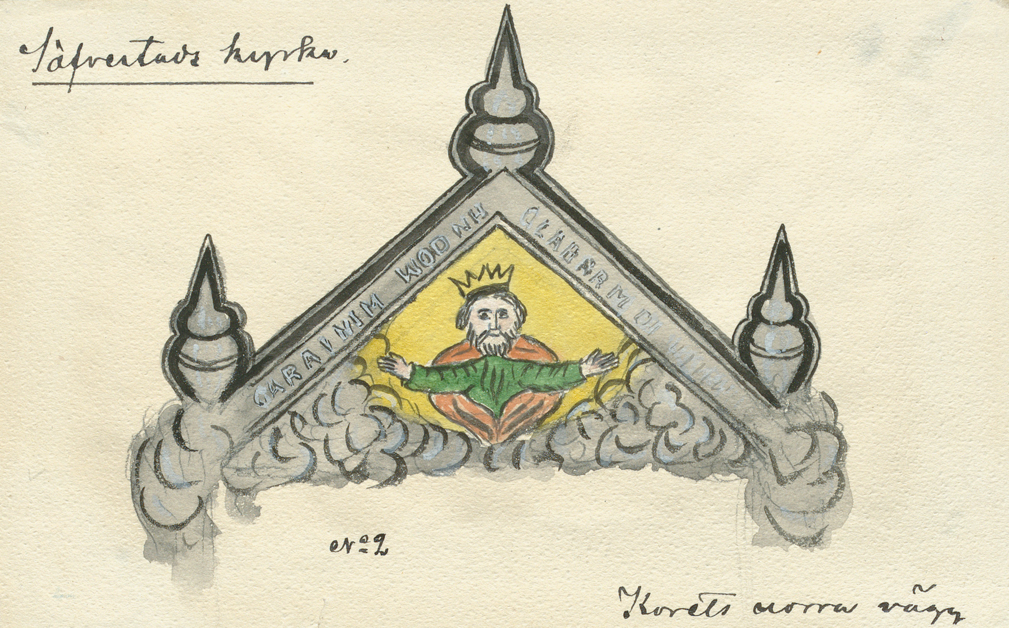 Kalkmaleri på korets nordvæg, sikkert fra 1600-tallet. Gud Fader troner i Himlen.