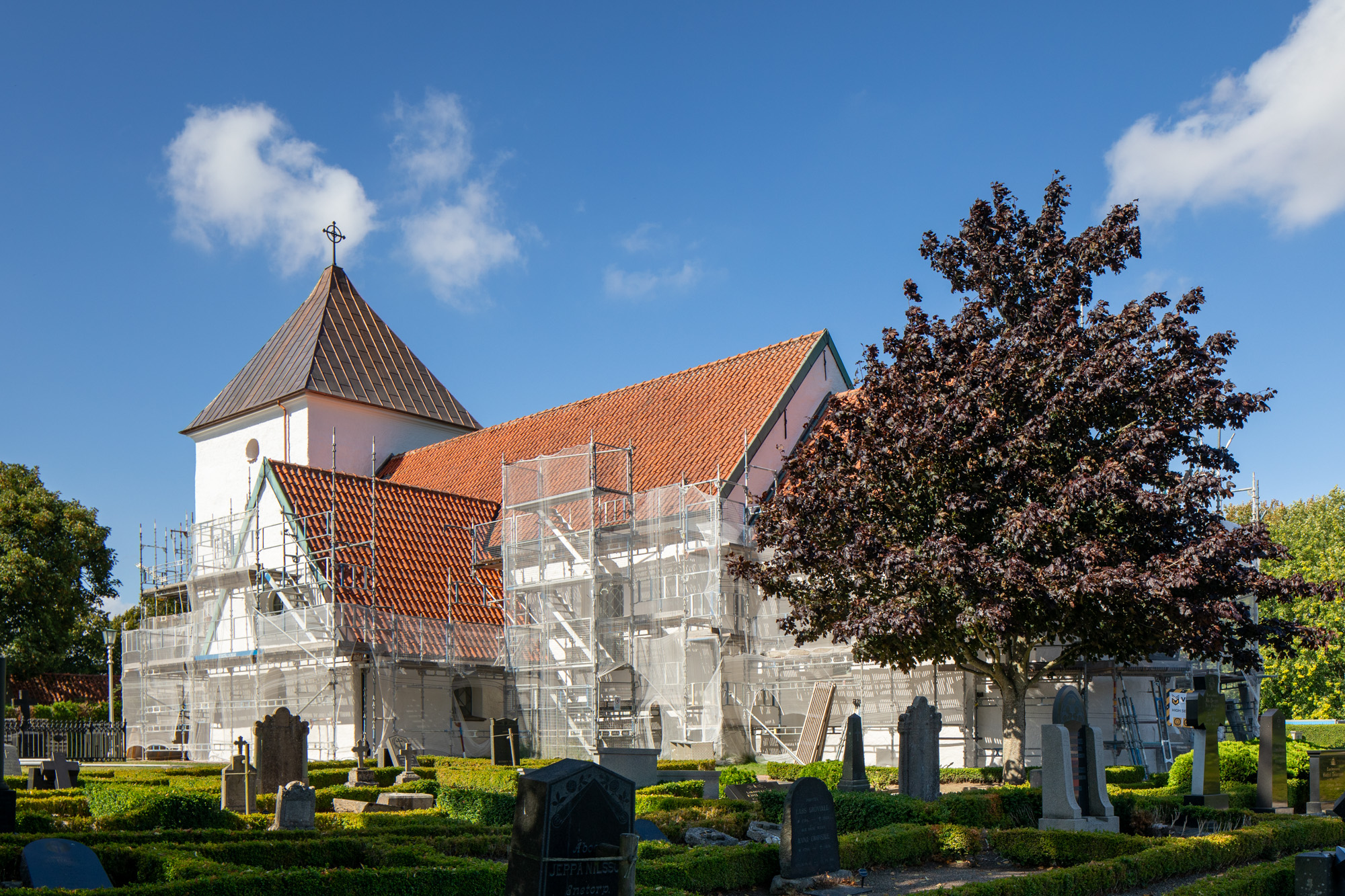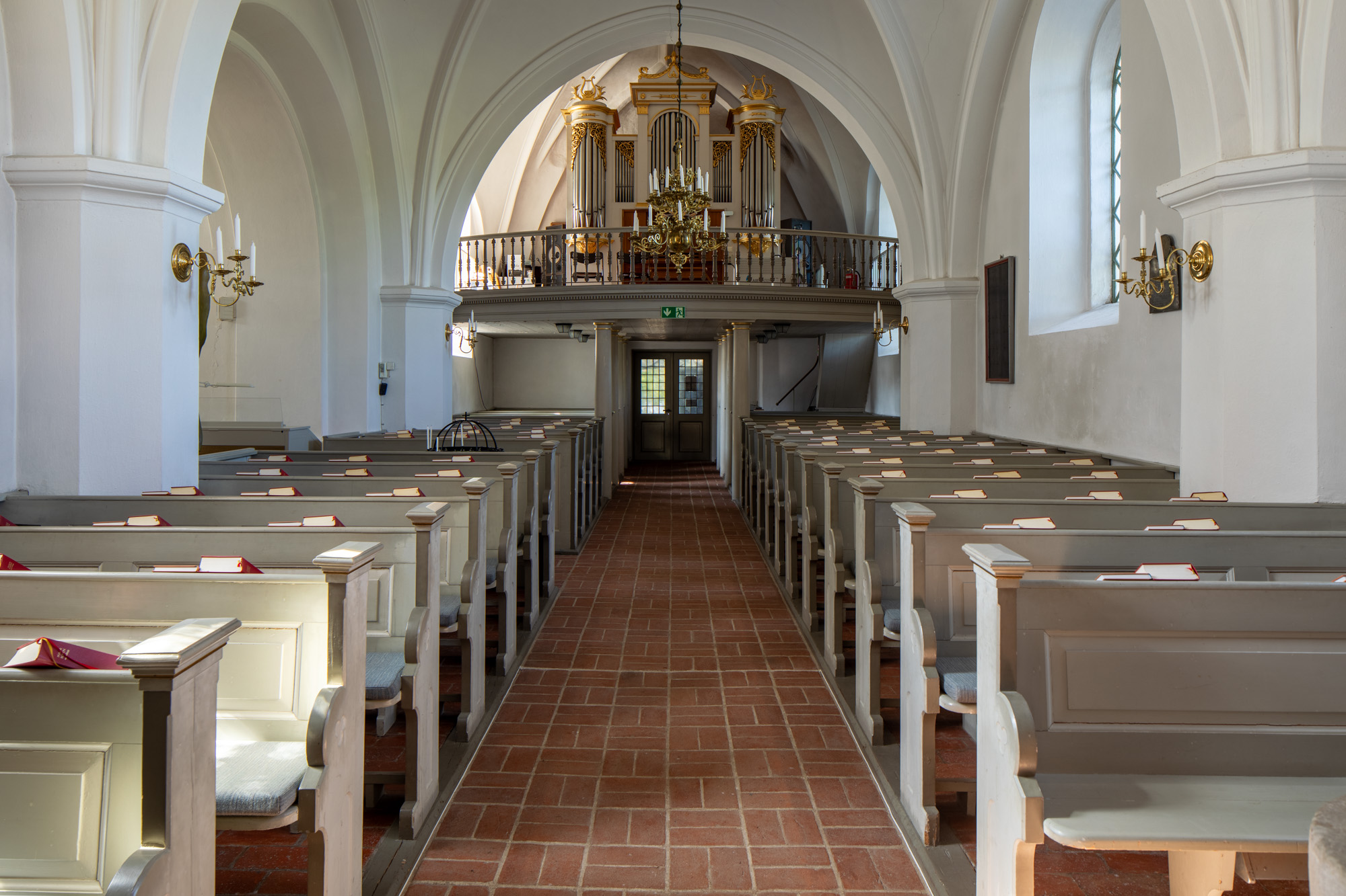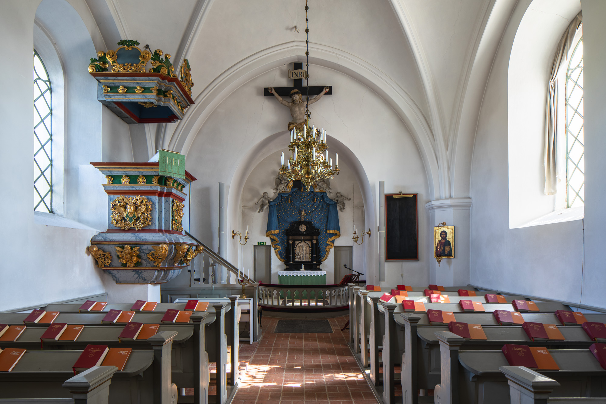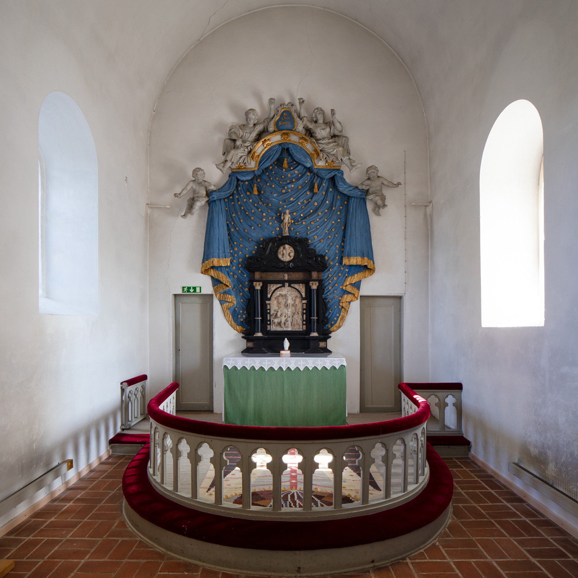 Draperiet på væggen bag altertavlen er udført af Johan Jerling i 1720’erne.