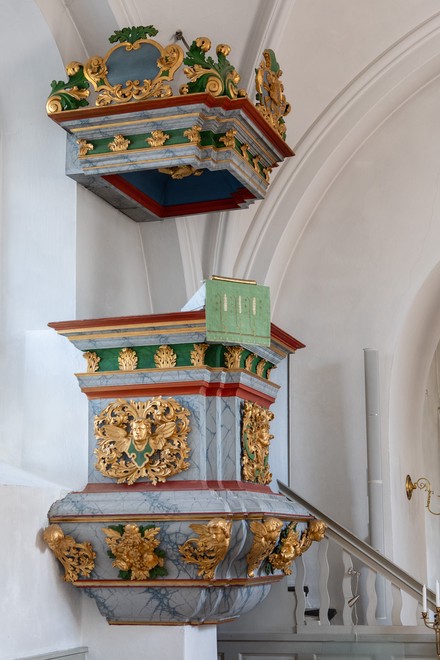 Prædikestolen er udført af Johan Jerling 1727.