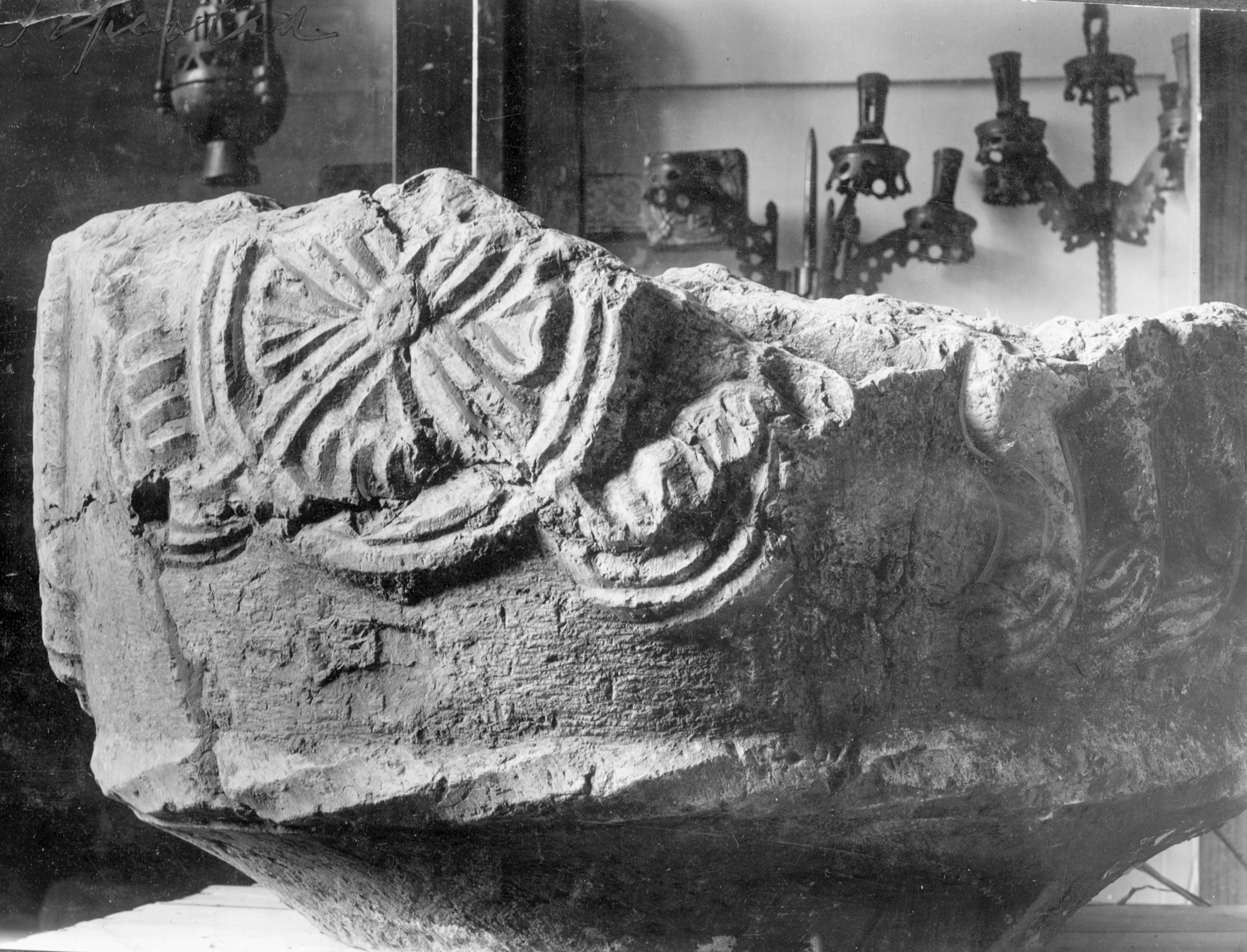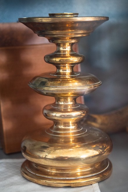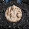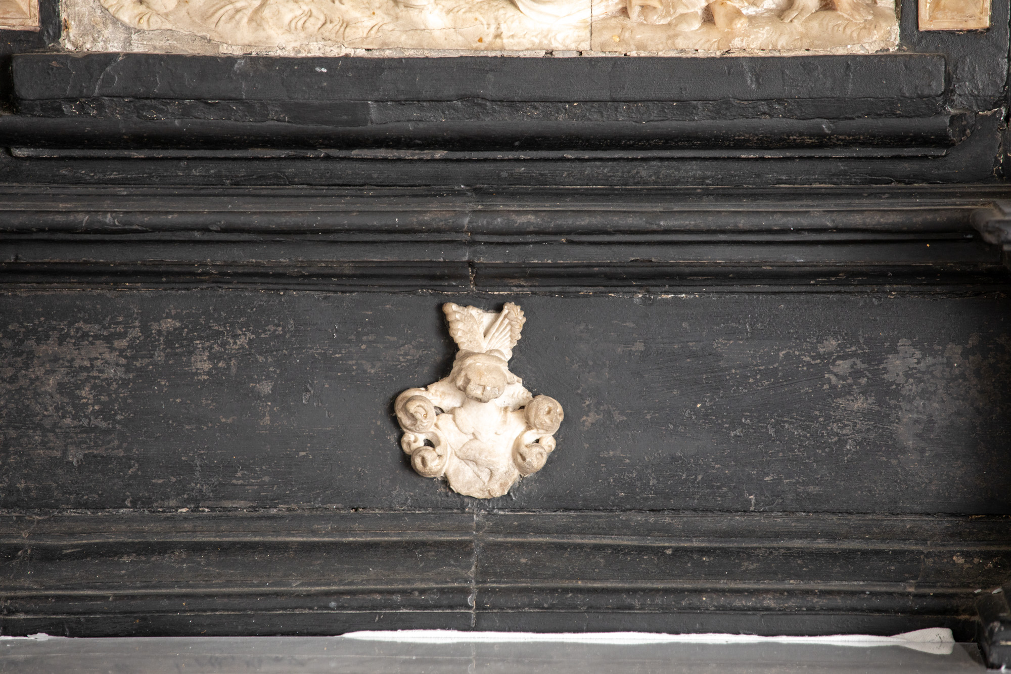 Langs sidens underkant går en løst snoet tovstav. To dyr er vendt mod hinanden. Man ser benene med lange kløer. Kuglen mellem de to dyr har sikkert været det ene dyrs nedhængende tunge. Dertil kommer to stiliserede englefigurer, en ring med akantusblad og palmetter. Ornamentikken tyder på, at den er udført af Carl Stenmester.