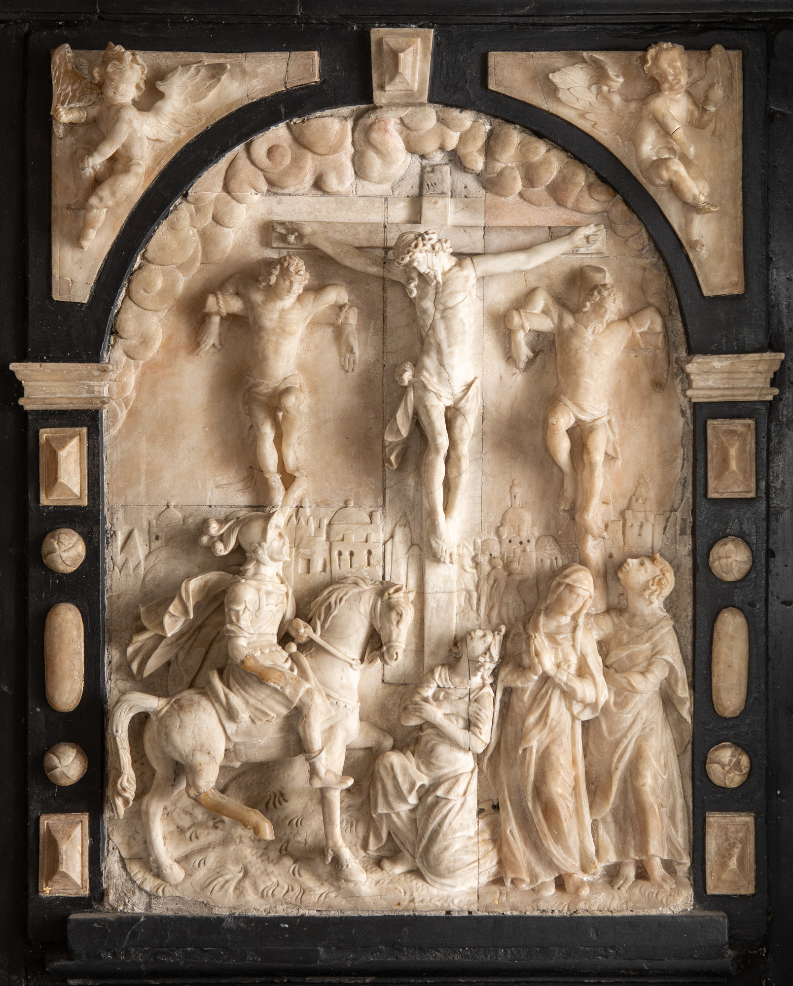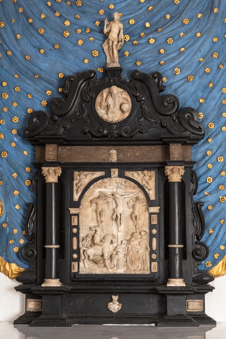 Altertavlen er udført i sort sten med indsatte alabastrelieffer. Motivet på storstykket er Kristus og røverne på korset med tre kvinder og en soldat til hests.