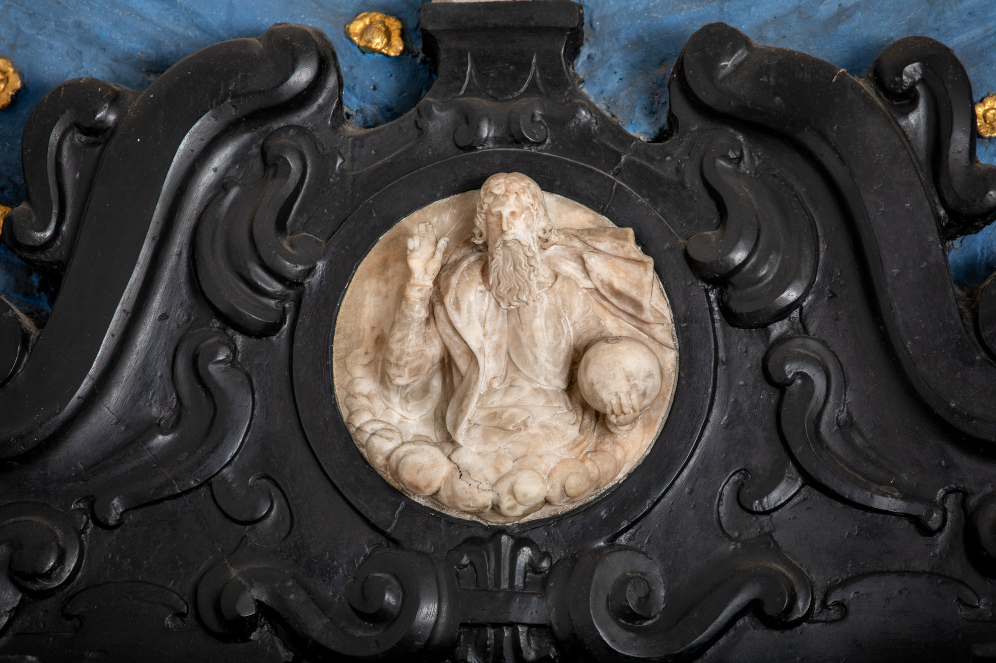 På fodstykket sidder slægten Marsvins våbenskjold samt årstallet 1627. På siderne af konsollerne, der bærer topstykket, ses initialerne IH, KW, IO og KW.