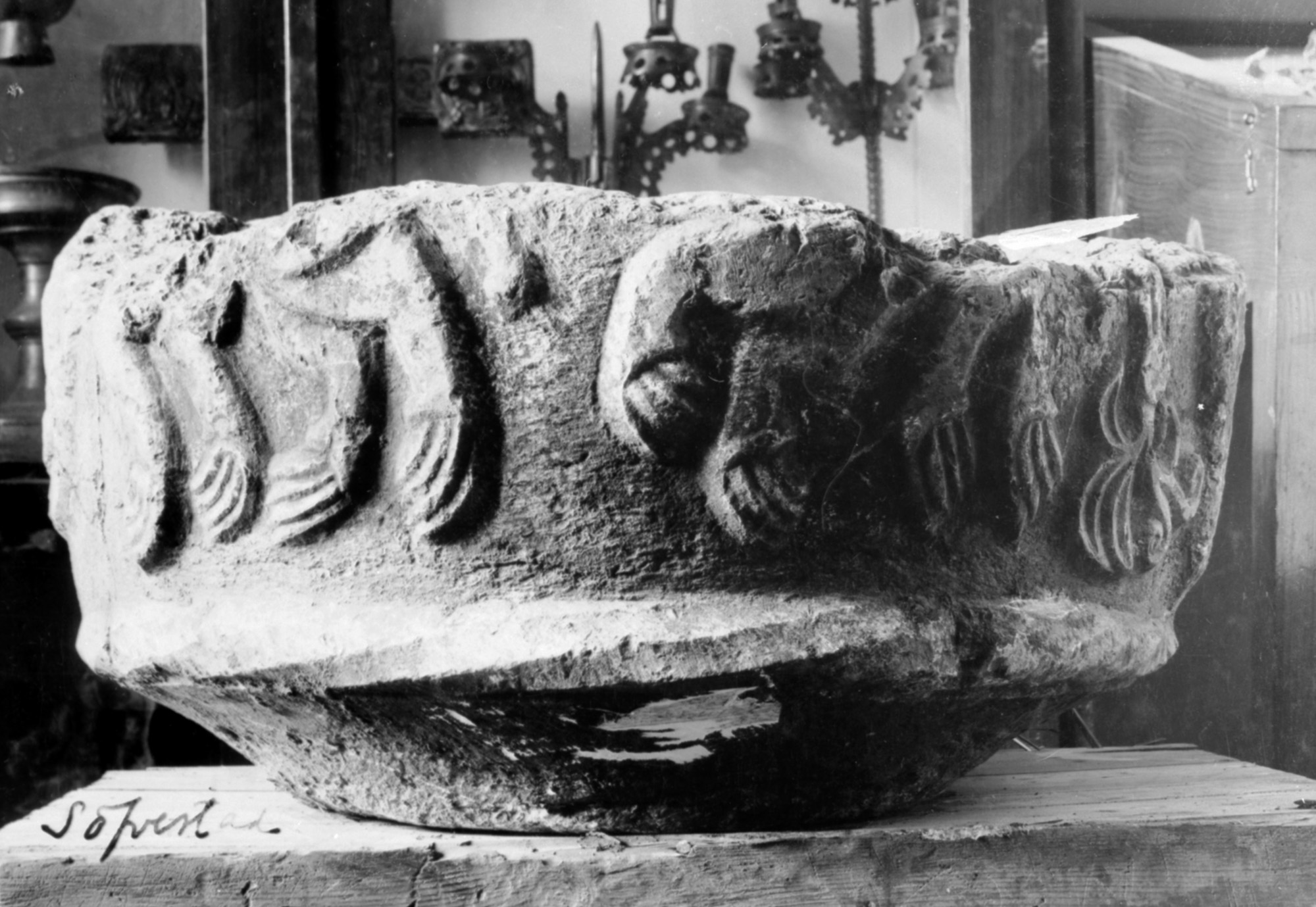 Den skal være fundet i præstegårshaven i Søvested, men stammer formodentlig fra en af egnens nedrevne kirker. Nu opbevares den på Lunds Universitets Historiska Museum.