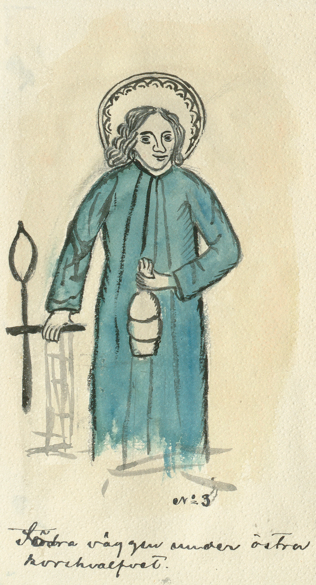 Sydvæggen: Laurentius støtter højre hånd på sin rist og holder noget i venstre hånd, som kan være en pung.