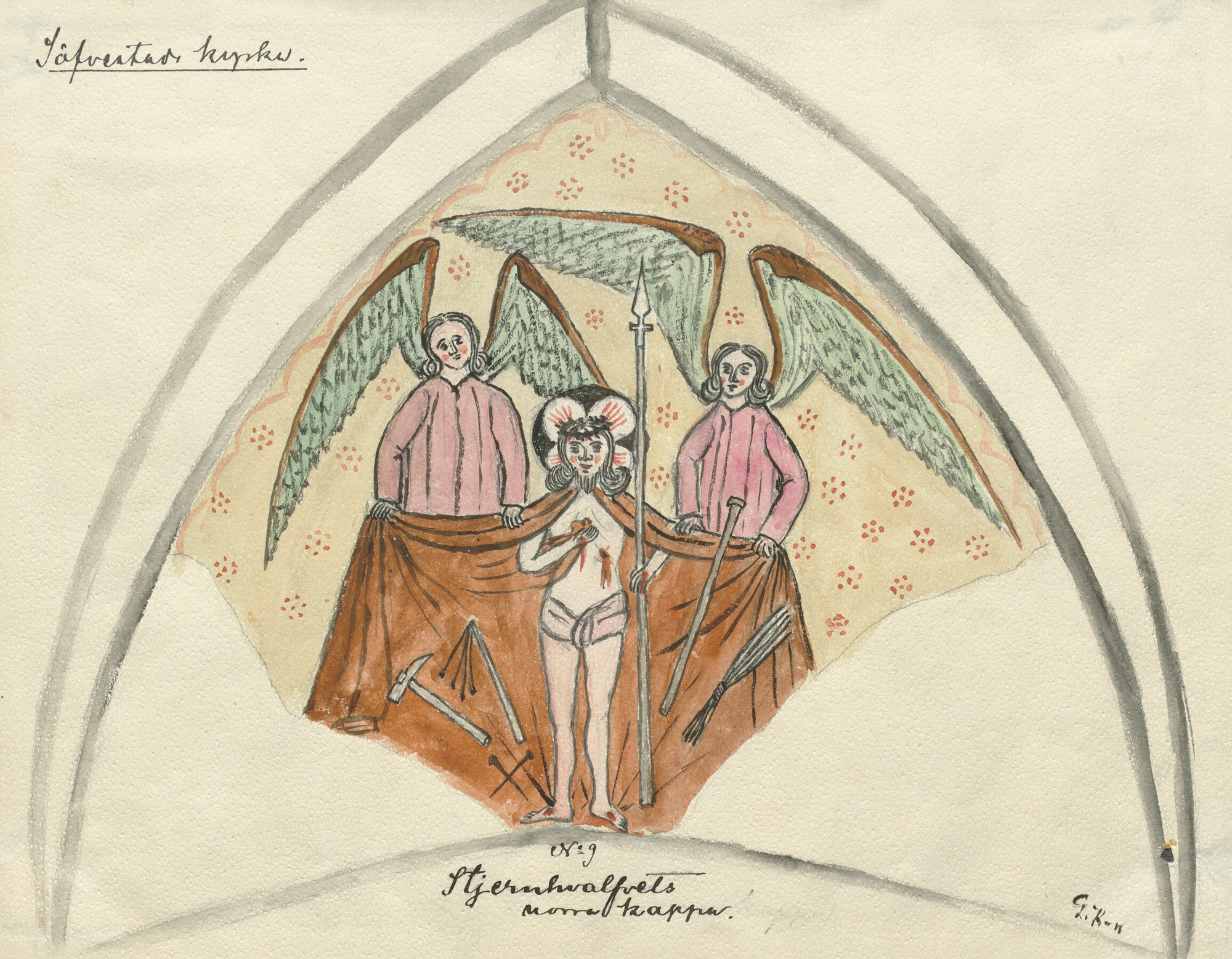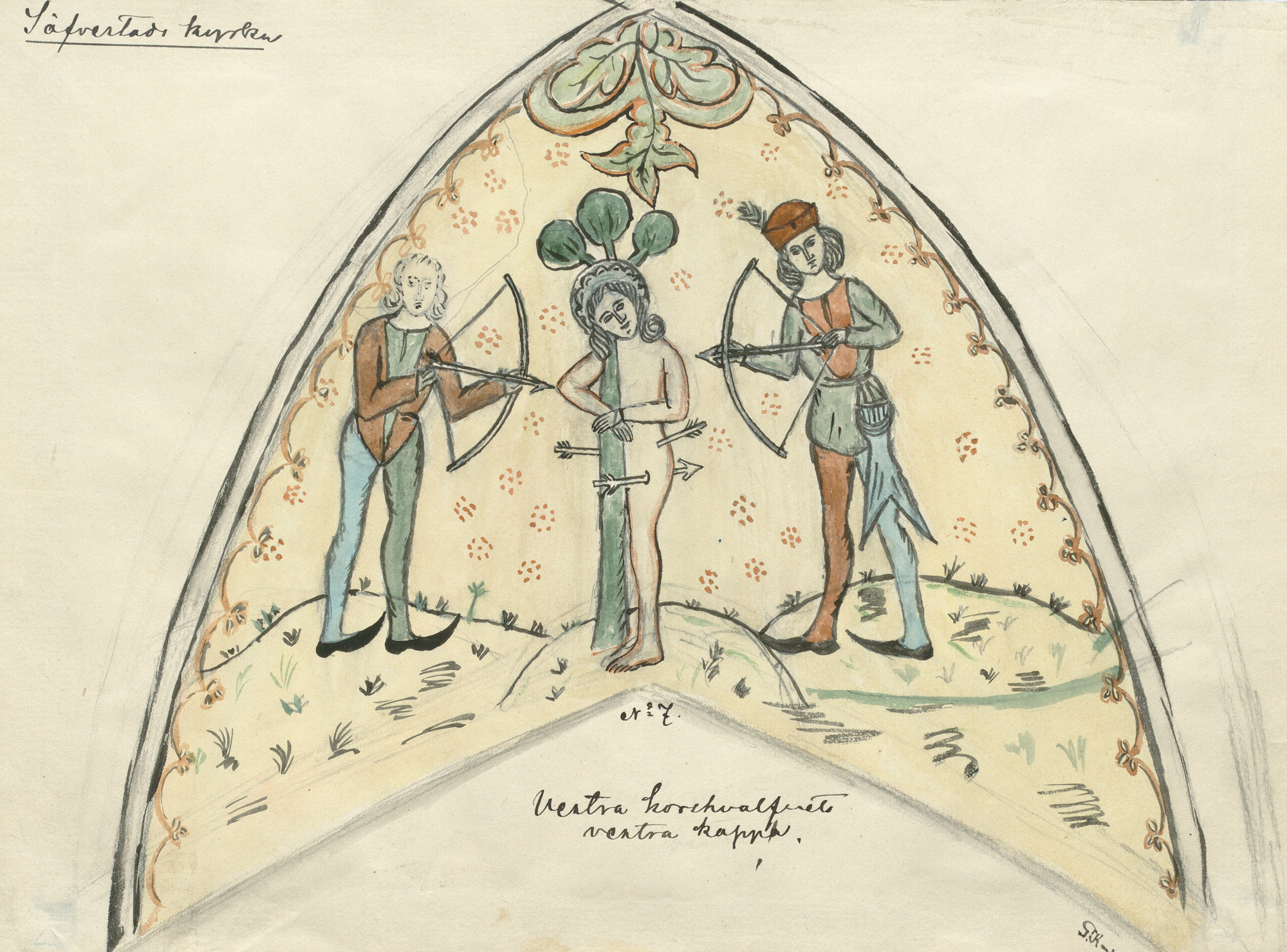 Vestkappe: Sebastians martyrdød. To mænd skyder pile mod ham.
