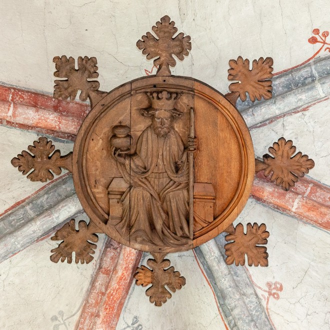 På konsollen for den midterste søjle er der et malet billede af S. Oluf rex, kong Olav den hellige. På feltet derefter står der: