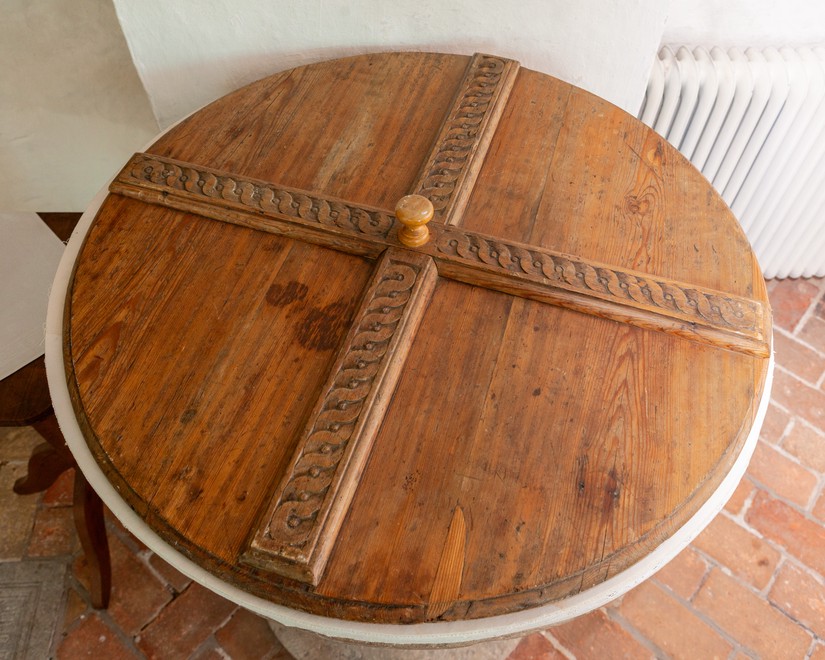 Sviklen mod syd er udvisket, men i sviklen mod nord sidder en mand på en stol og spiser, idet han holder en stor ske i venstre hånd.
