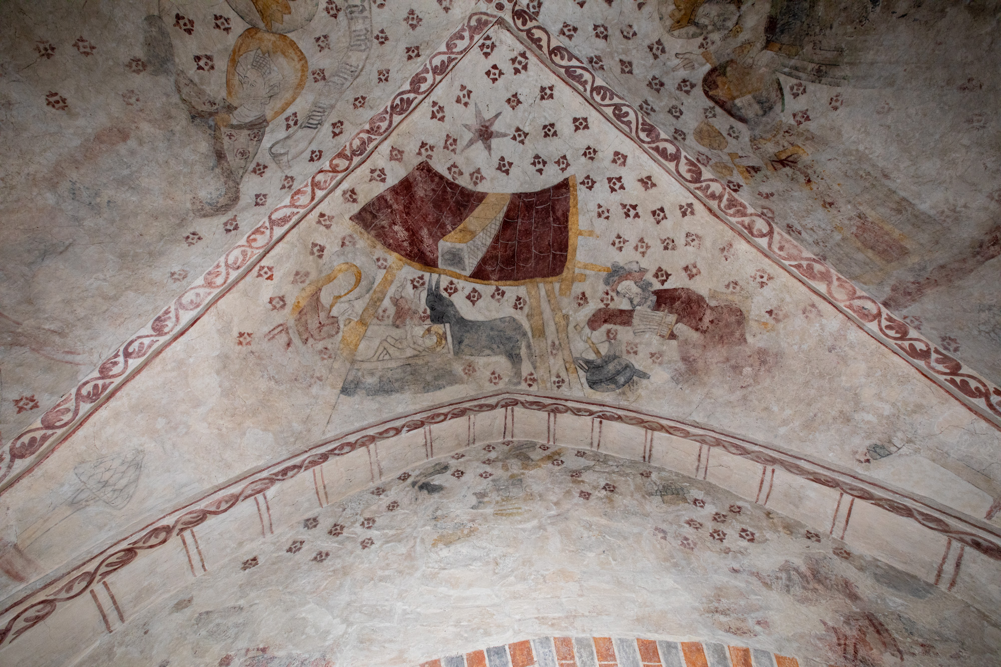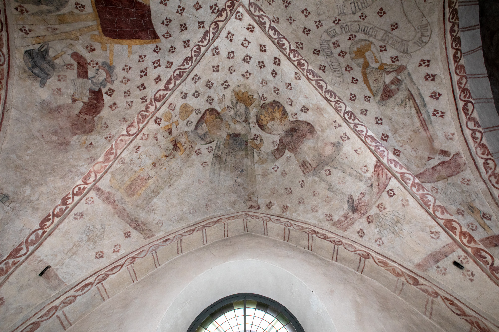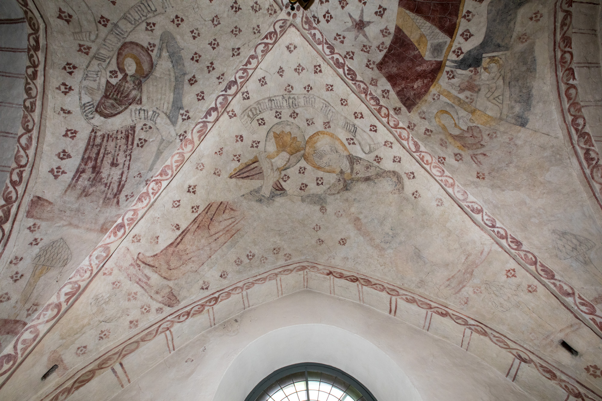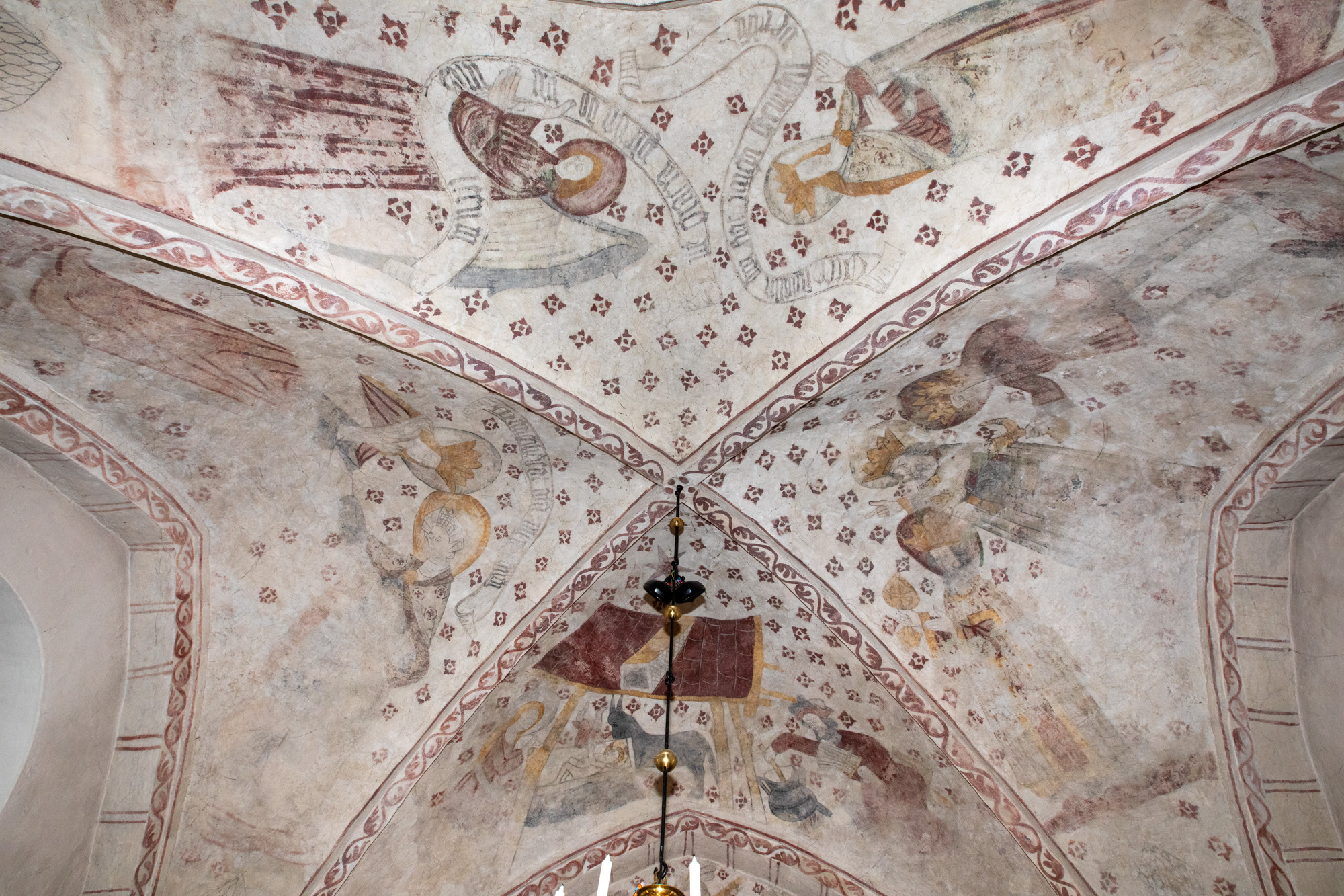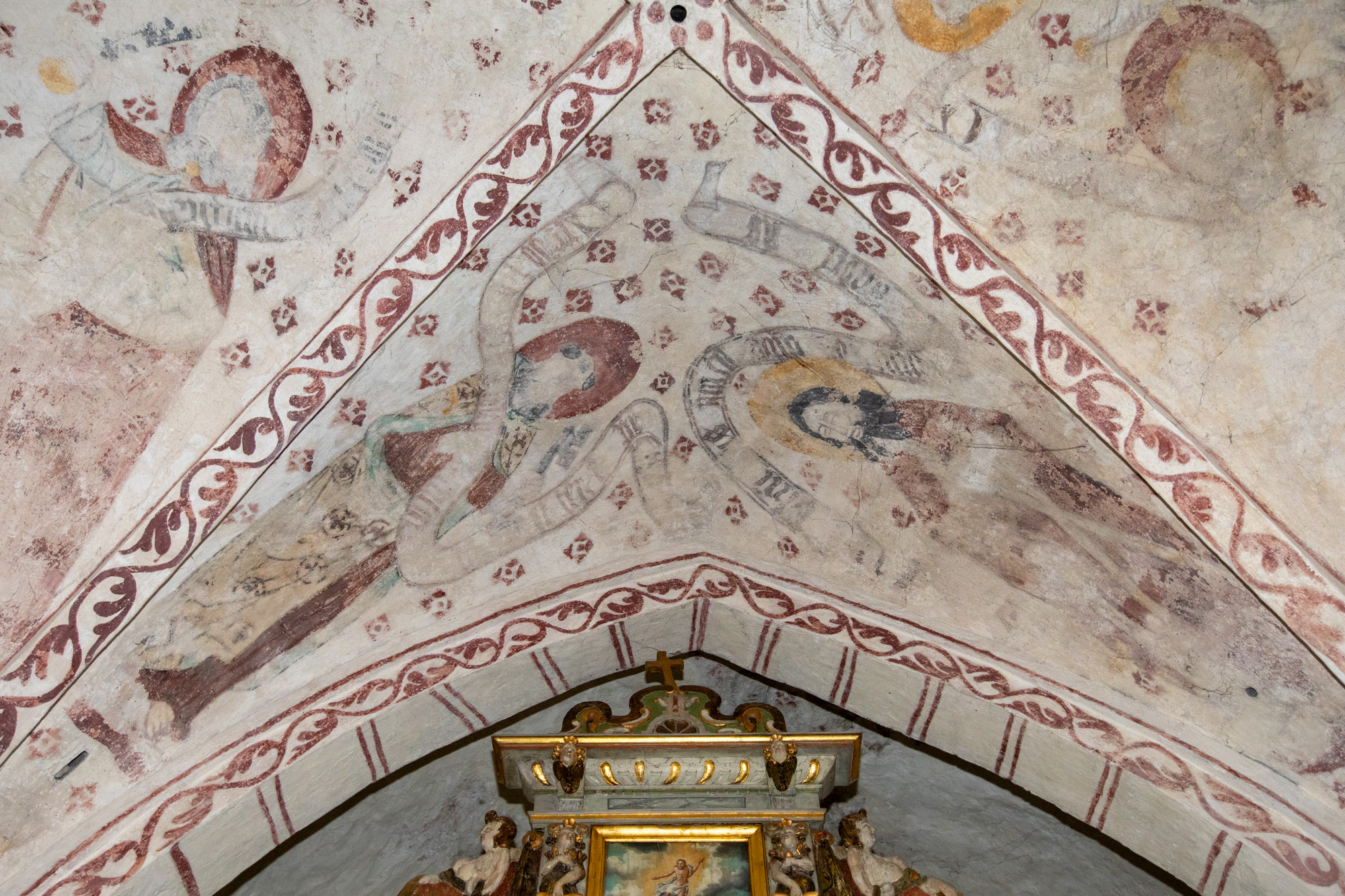 Kalkmalerierne er udført af Lille Harrie værkstedet omkring år 1500, og de fordeler sig over hele kirken fra apsis til tårn.