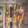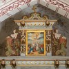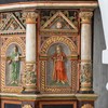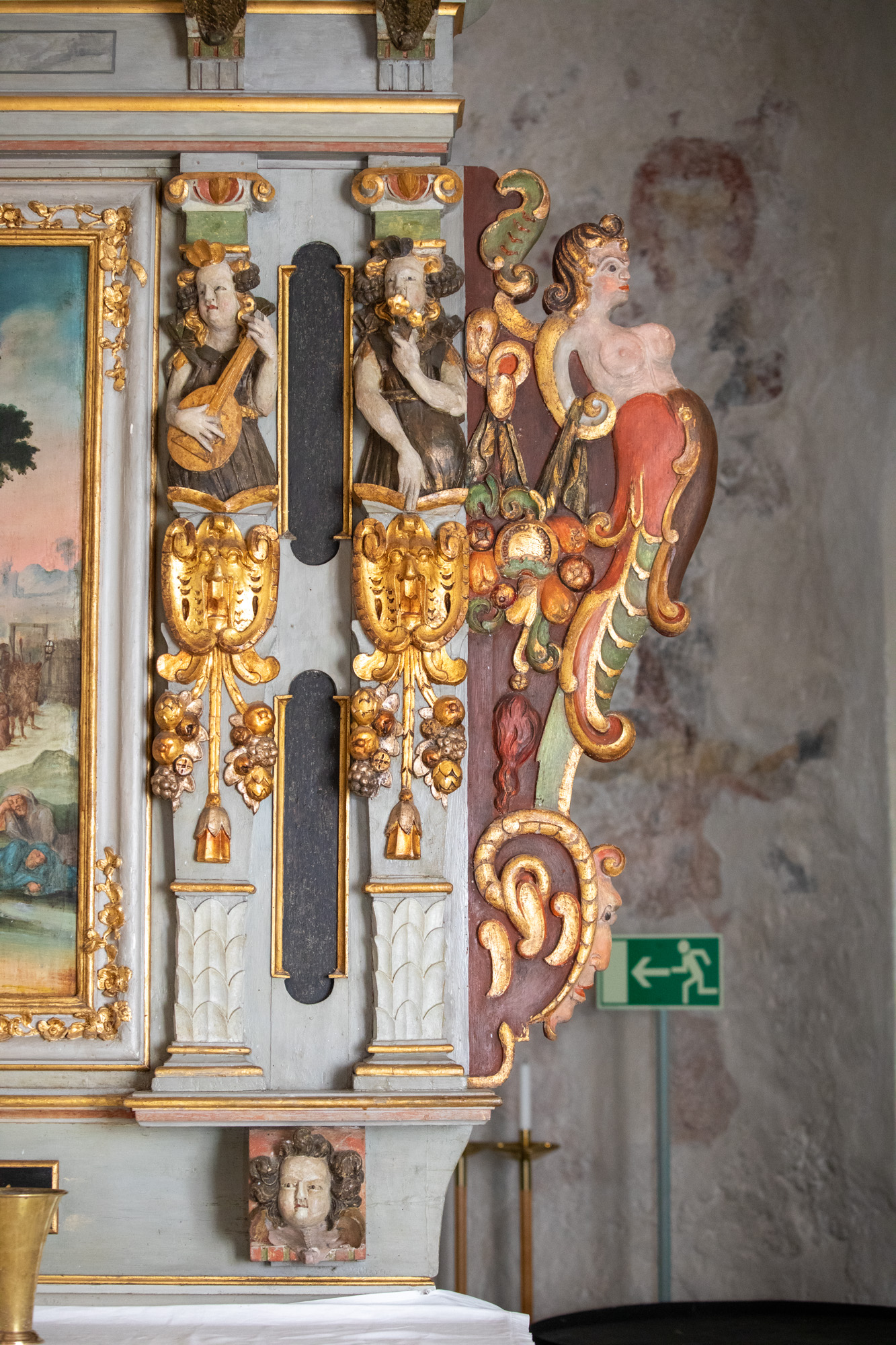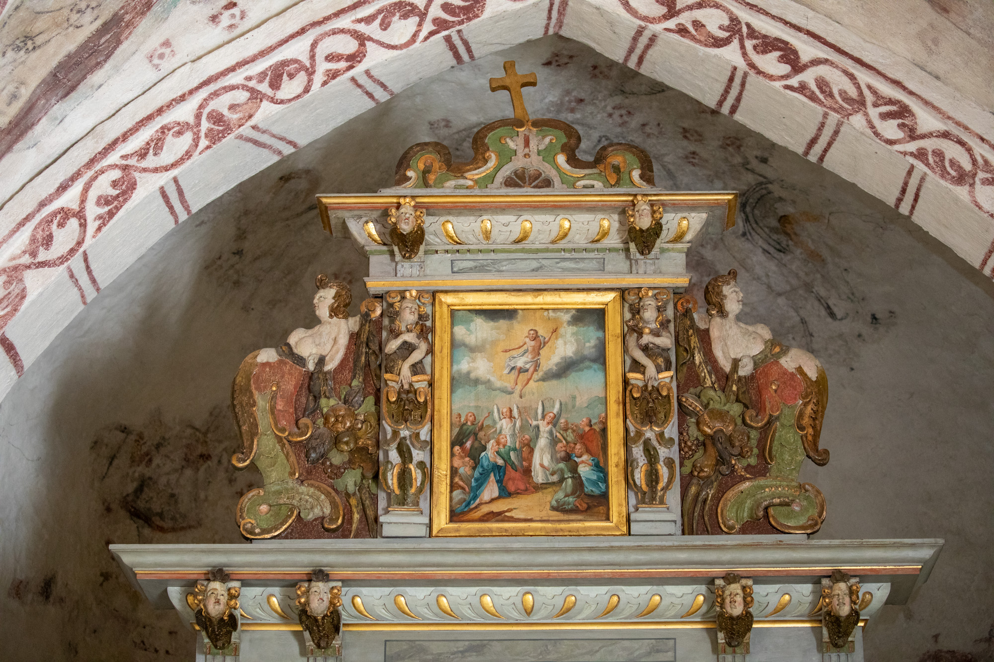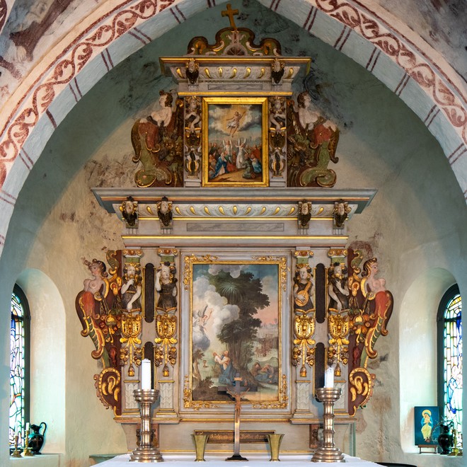 Altertavlen er fra midt i 1600-tallet, mens billederne er fra 1700-tallet. En af dobbelthermerne, der flankerer alterbilledet spiller lut. De tre andre holder også noget i hænderne. Måske frugter og blomster hos de to af dem, men det er vanskeligt at afgøre. Mellem hermeparrene er der to lang-smalle felter. Billederne, der forestiller Jesu bøn i Getsemane Have og Himmelfarten er kopier fra 1700-tallet af billeder af en fransk maler, der hed Tarabal.