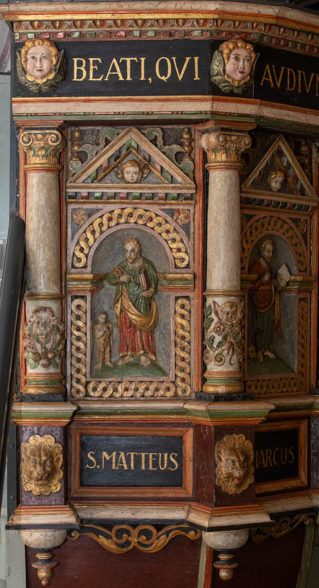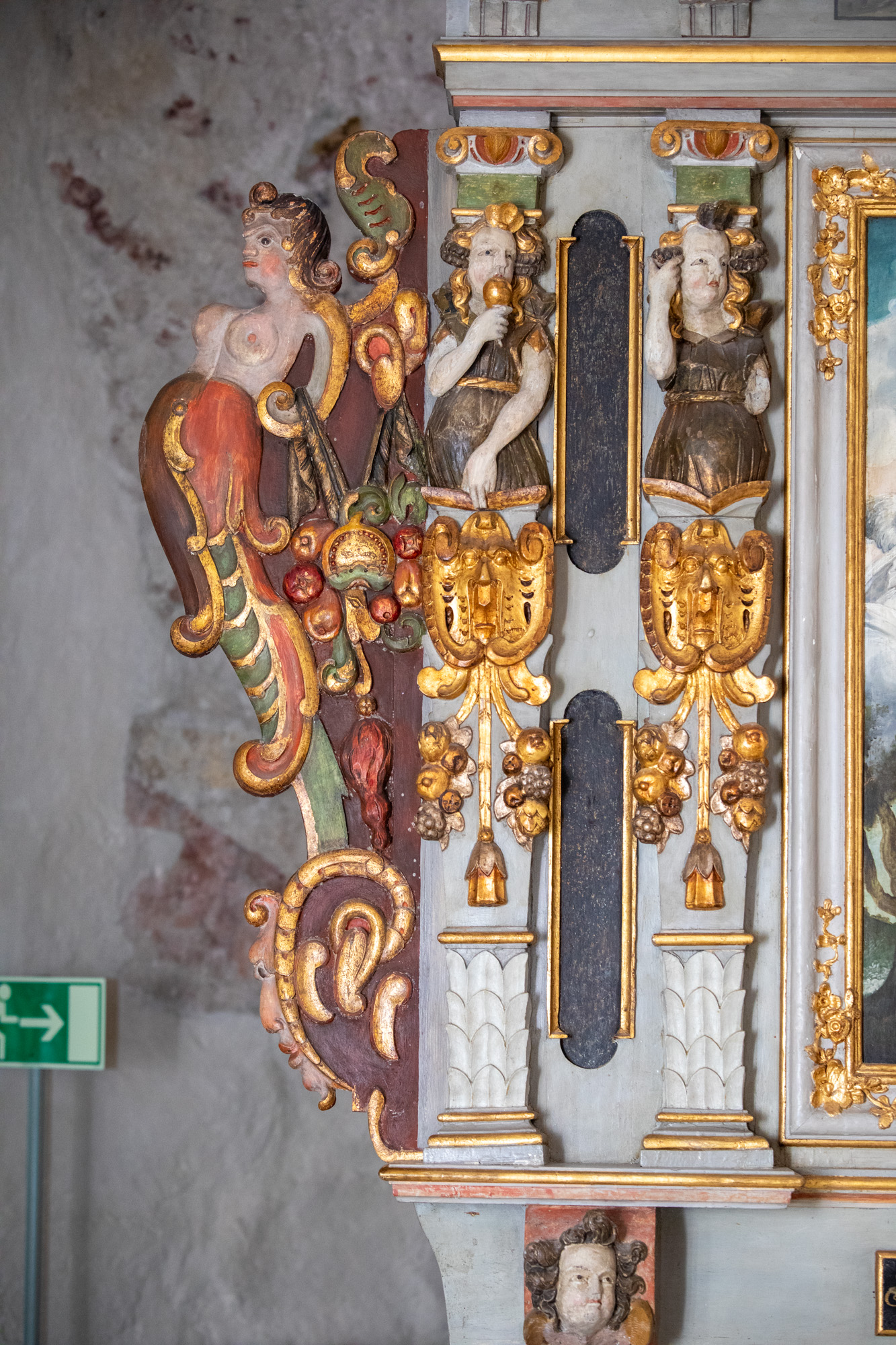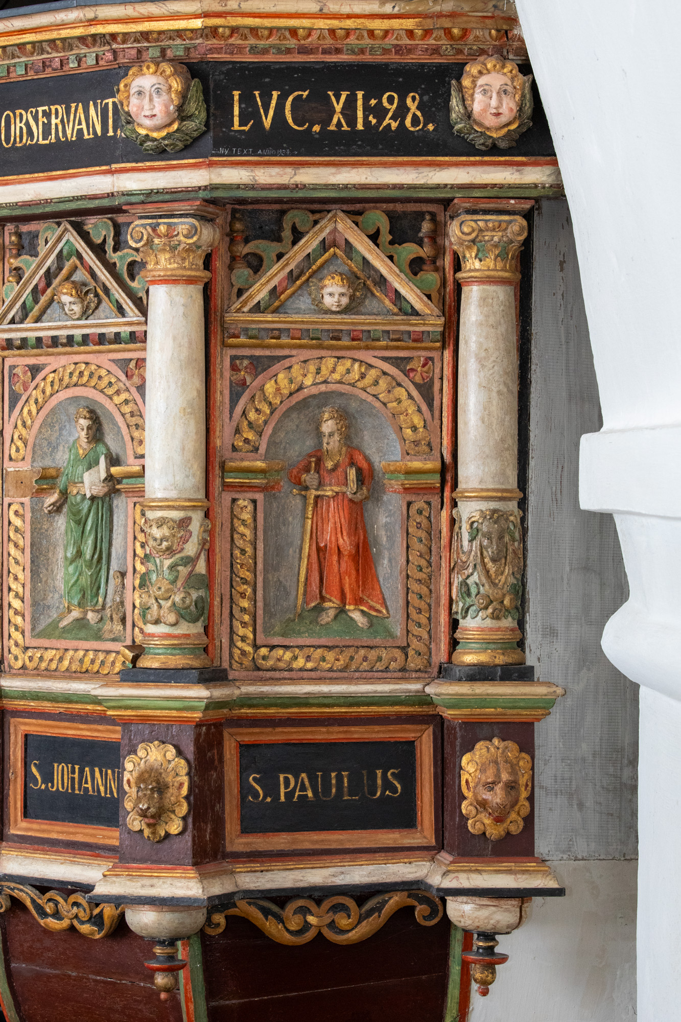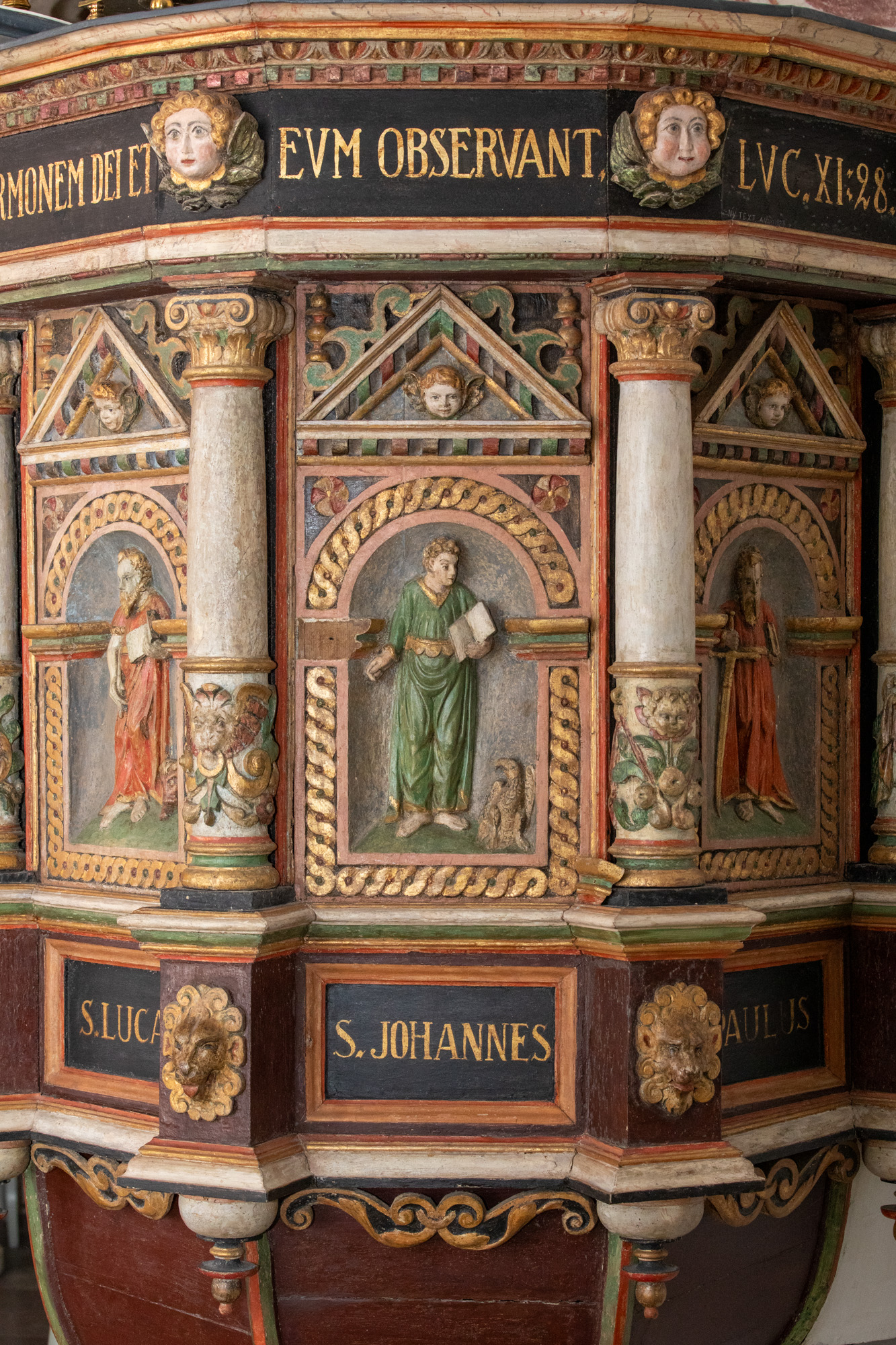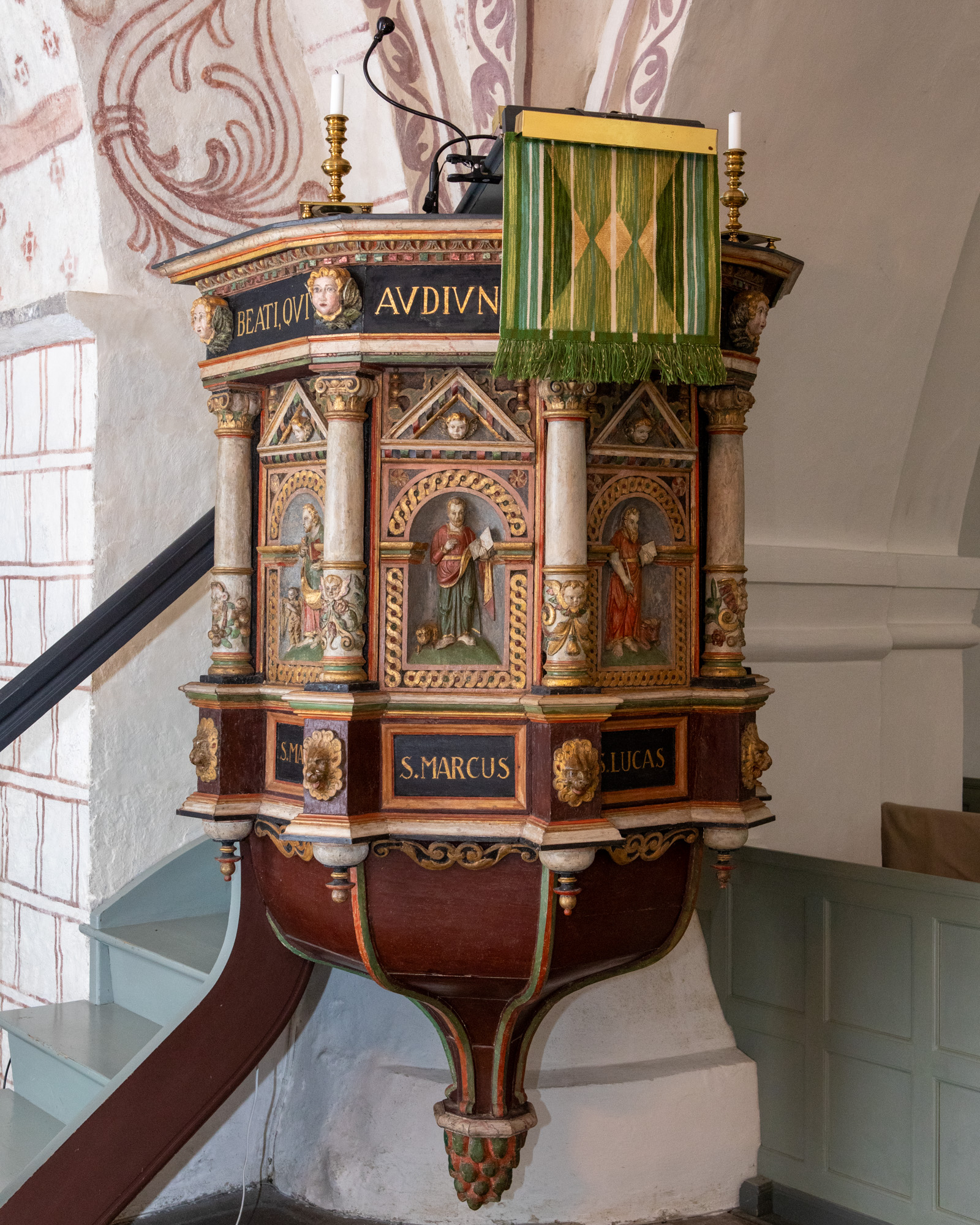 Prædikestolen har så mange ligheder med prædikestolen i Ørsø / Örsjö, at man må gå ud fra, at de er lavet på samme værksted.