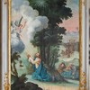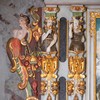 Motiverne i storfelterne indrammes af et rundbuefelt med slyngbånd og derover et gavlfelt med et englehoved og tandsnit. Mellem storfelterne står glatte søjler med doriske kapitæler og prydbælte med englehoved og bladornamentik.
