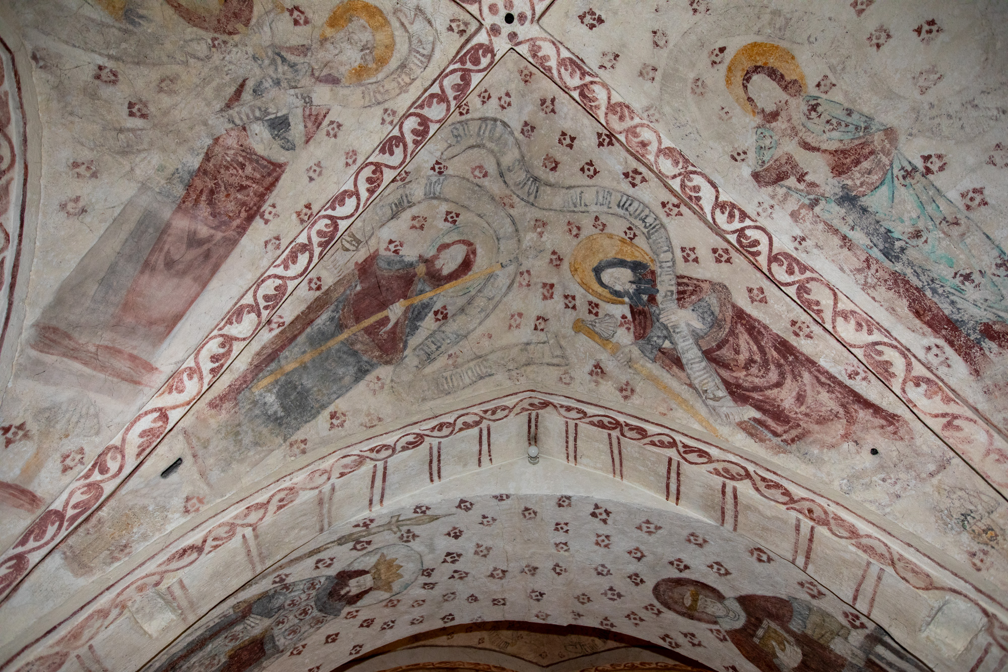 Vestvæg. S. Jørgen og dragen. Billedet er meget fragmentarisk. Øverst ses Jørgen med hovedbeklædning og skjold. I baggrunden kan man ane byen, og forneden i nordsiden anes prinsessen.