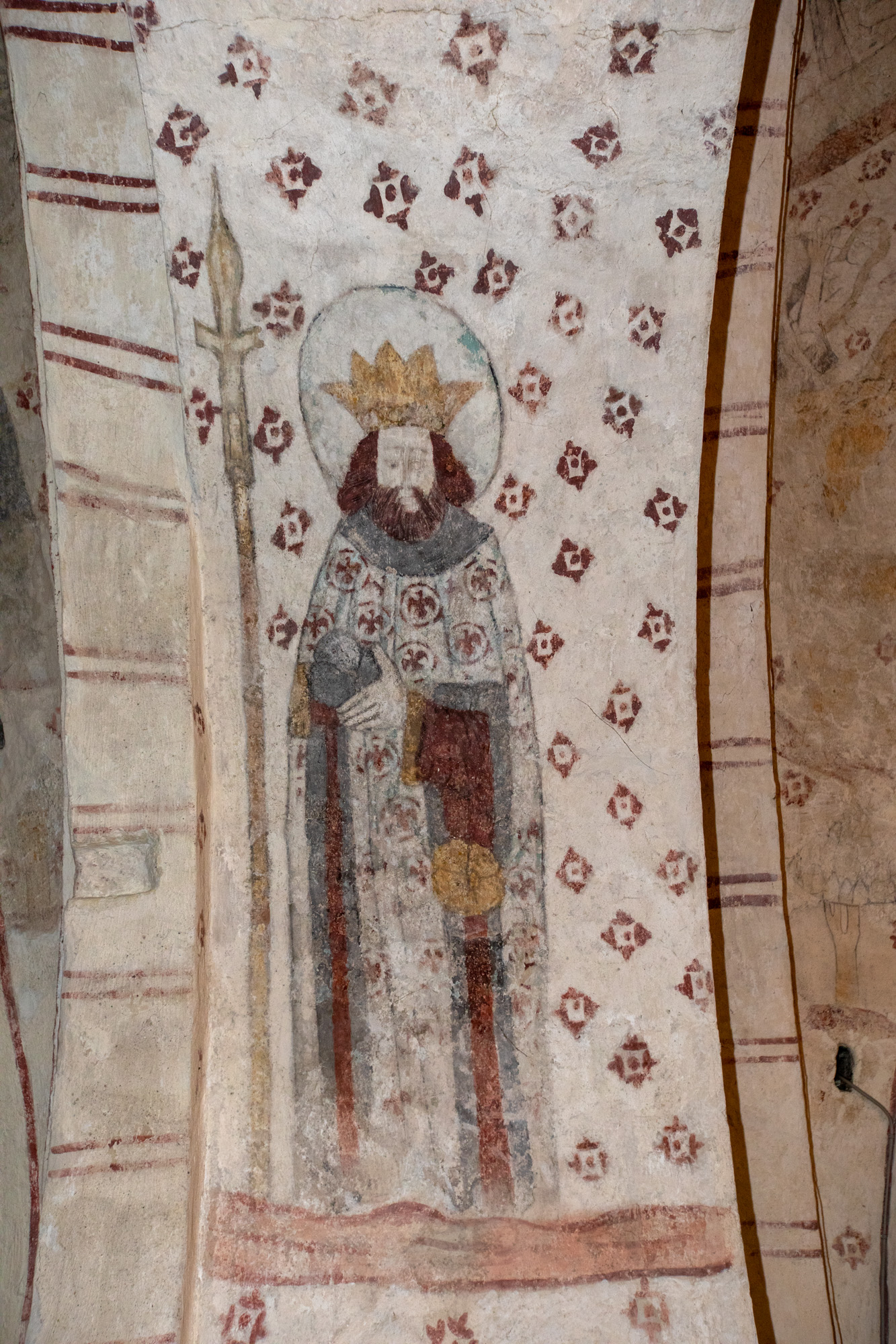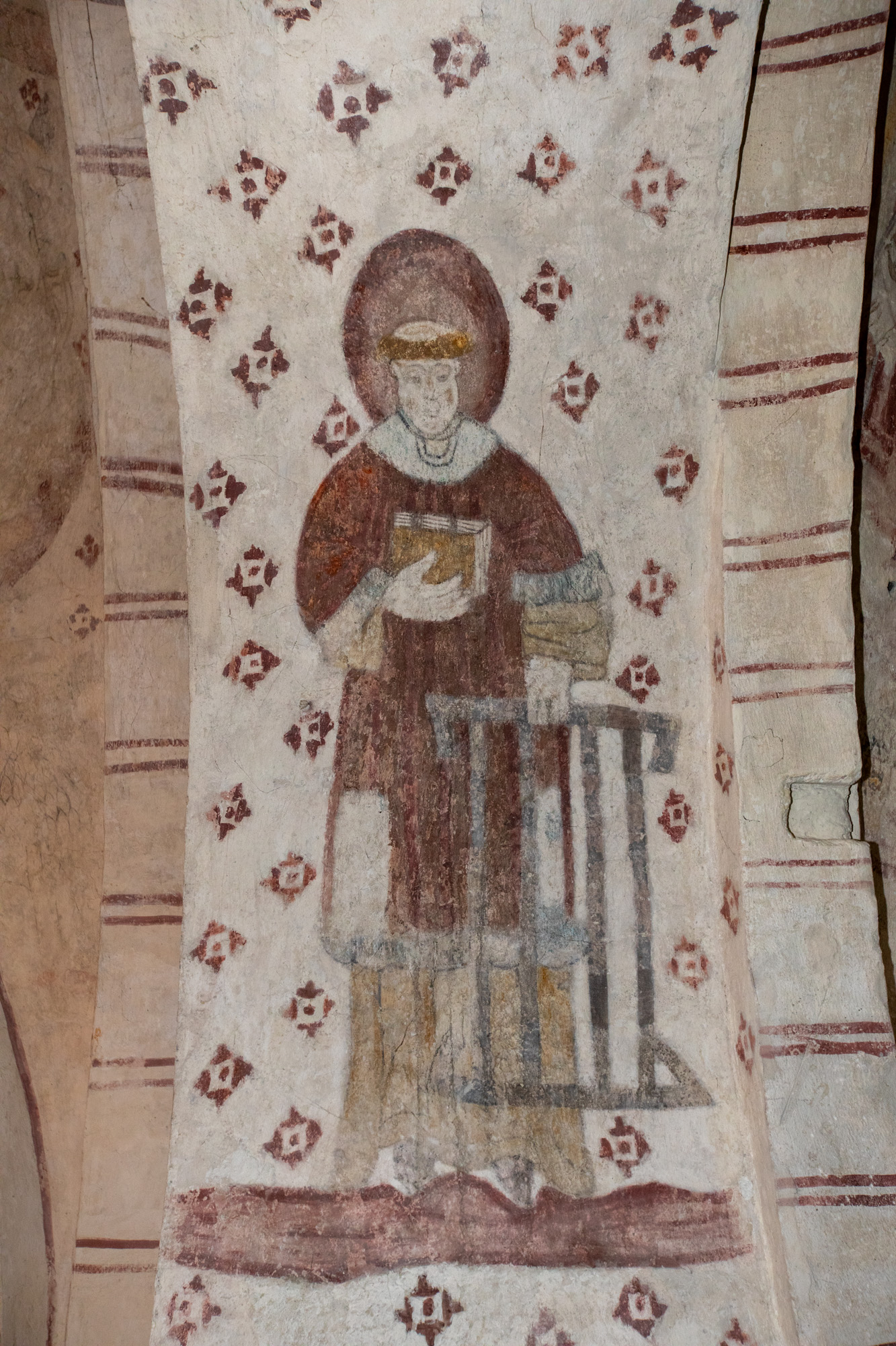 Sydvange. Knud den Hellige står med en lanse ved sin højre side. I venstre hånd holder han endnu en attribut, som kan være en krukke med låg, et ciborium. På det punkt ligner det et tilsvarende billede i Hässlunda – Heslunde.