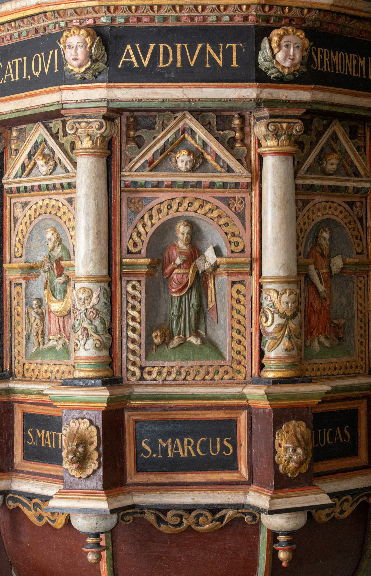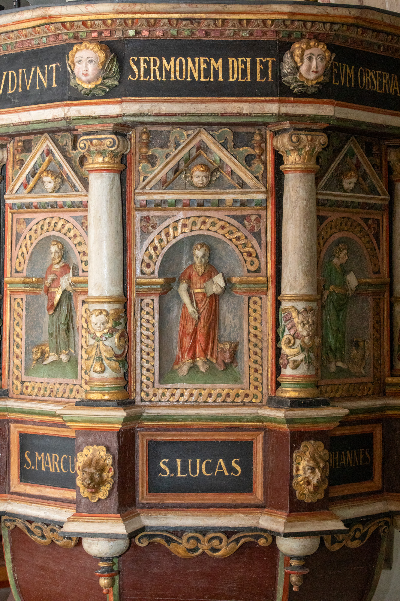 Prædkiestolen er et tidligt 1600-tals arbejde. De fem storfelter har fremstillinger af evangelisterne og Paulus. De oprindelige farver blev fremdraget ved en restaurering 1934.