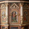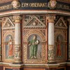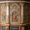 På konsollerne mellem de nederste smalfelter er der løvemasker. Teksterne oplyser navnet på evangelisten storfeltet ovenover. Under smalfelterne er der hængestykker og under hver konsol en kugle. Underbaldakinen afsluttes i noget, der kunne ligne en fugtklase.