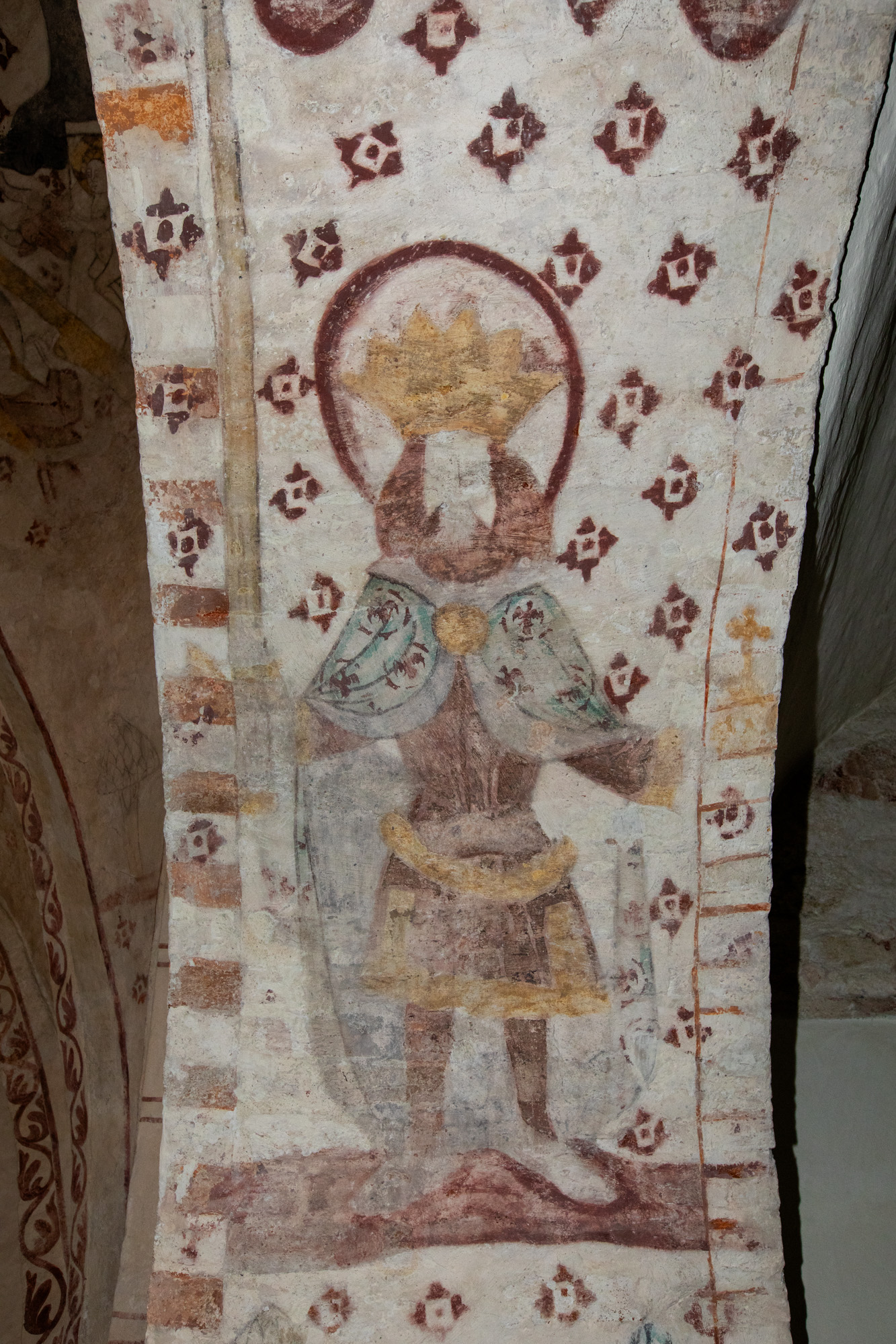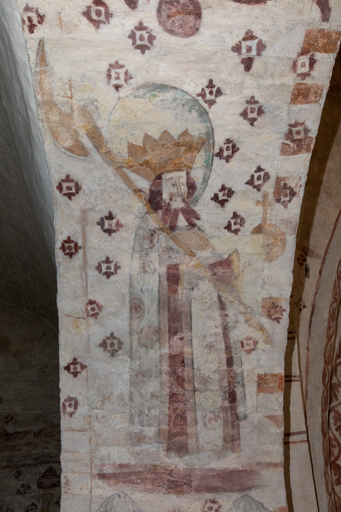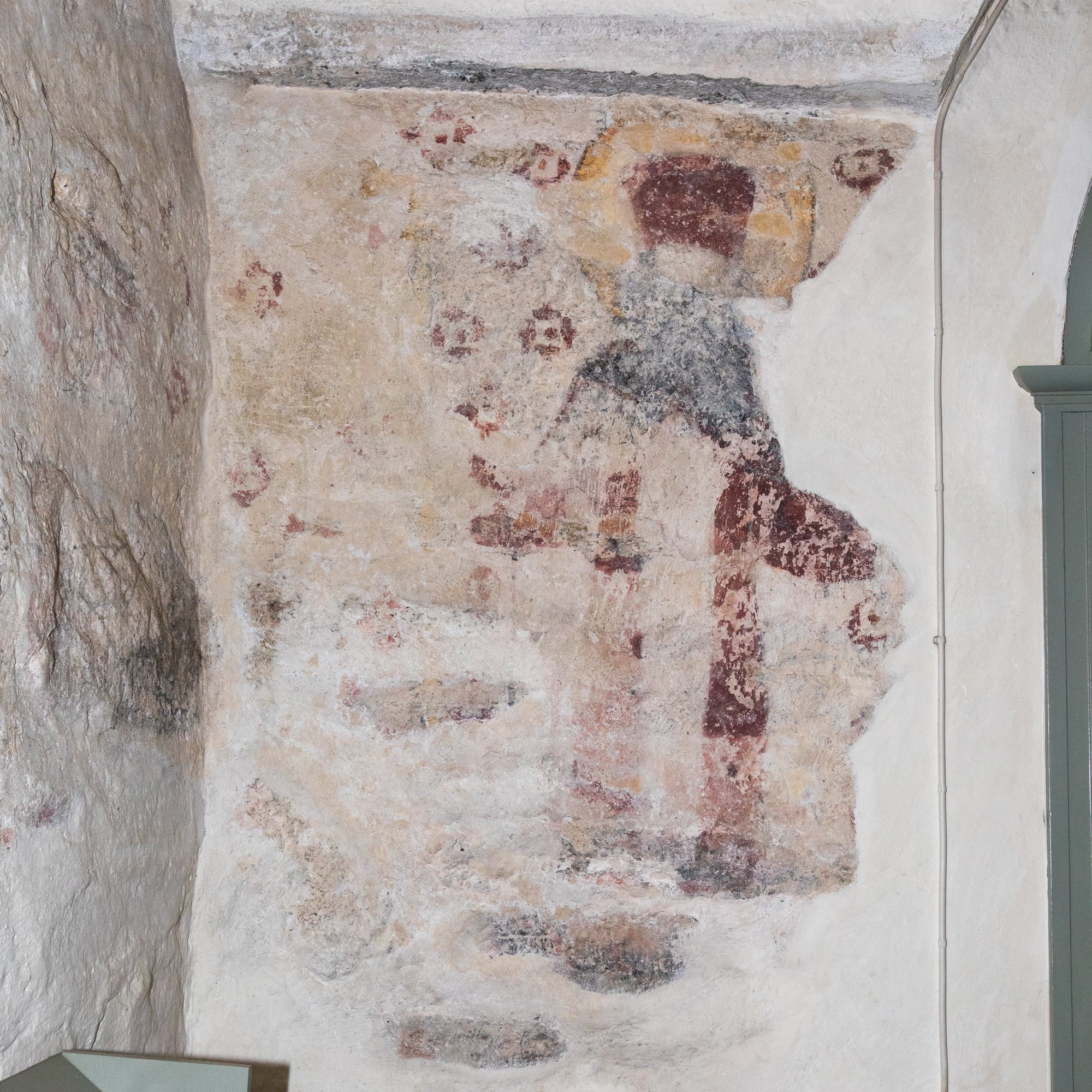 Vestvæg, syd for døren. Antonius. Billedet er utydeligt, og attributter mangler. Antonius har en tilsvarende højpuldet hat i Gessie.