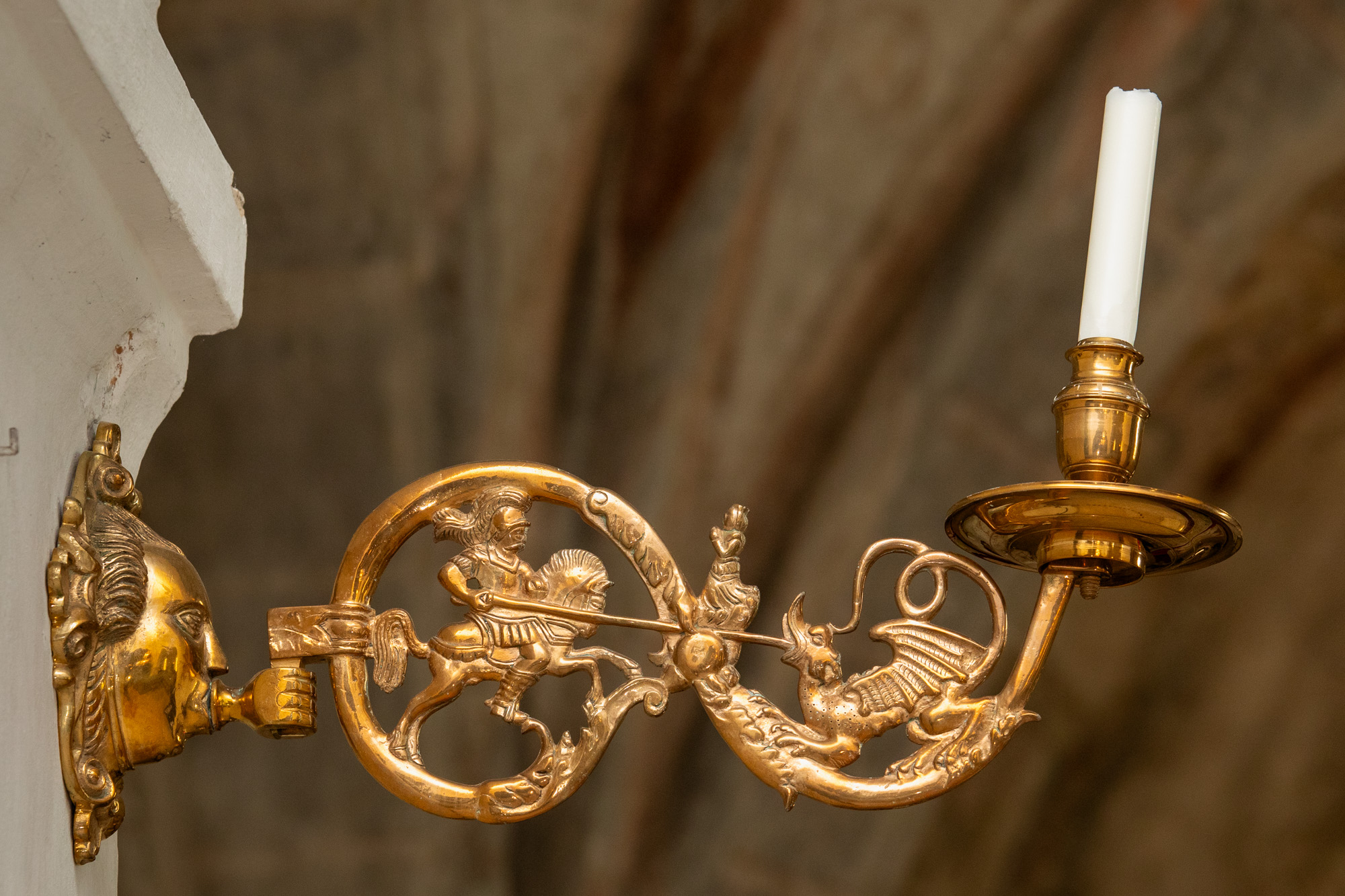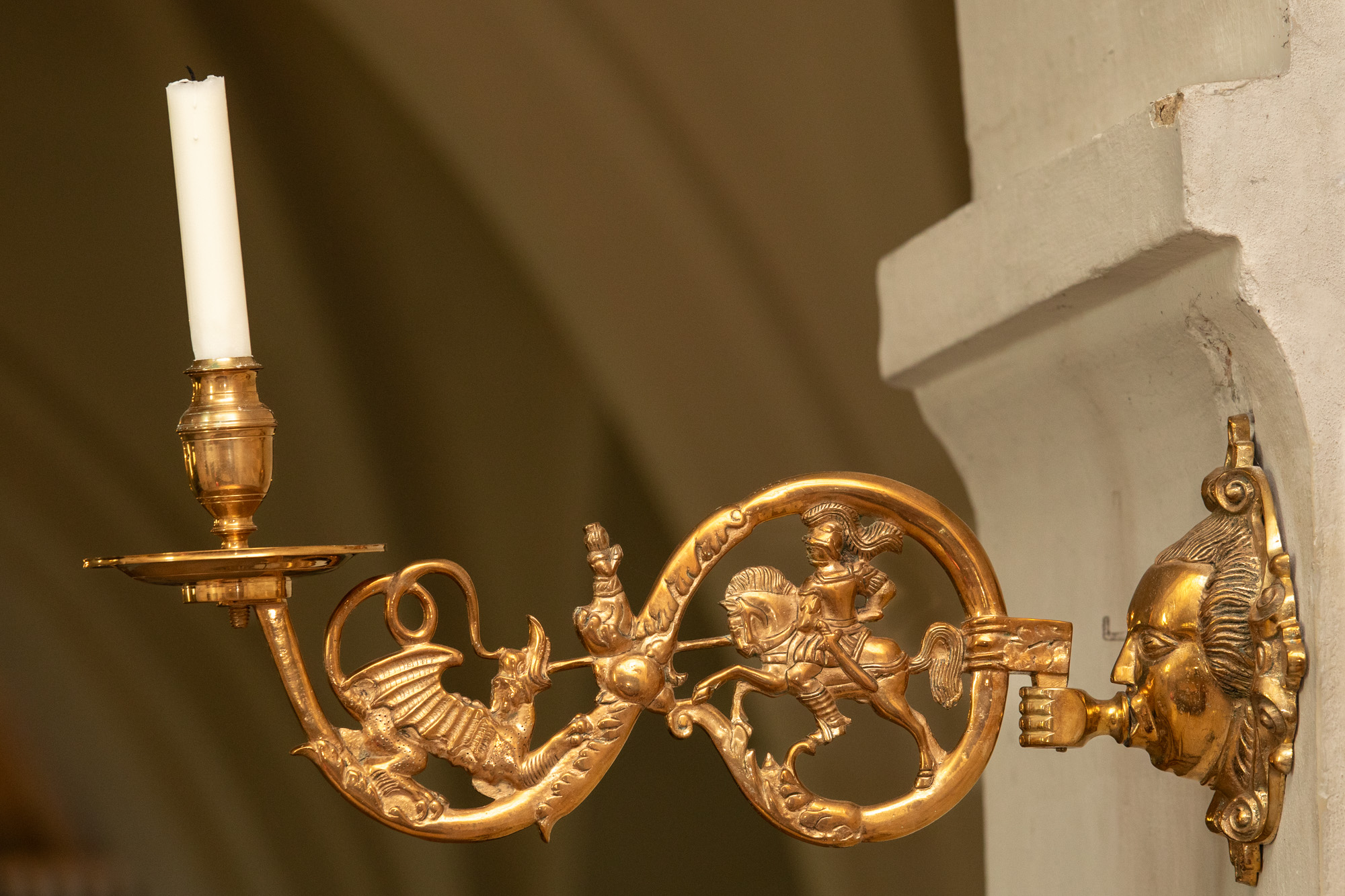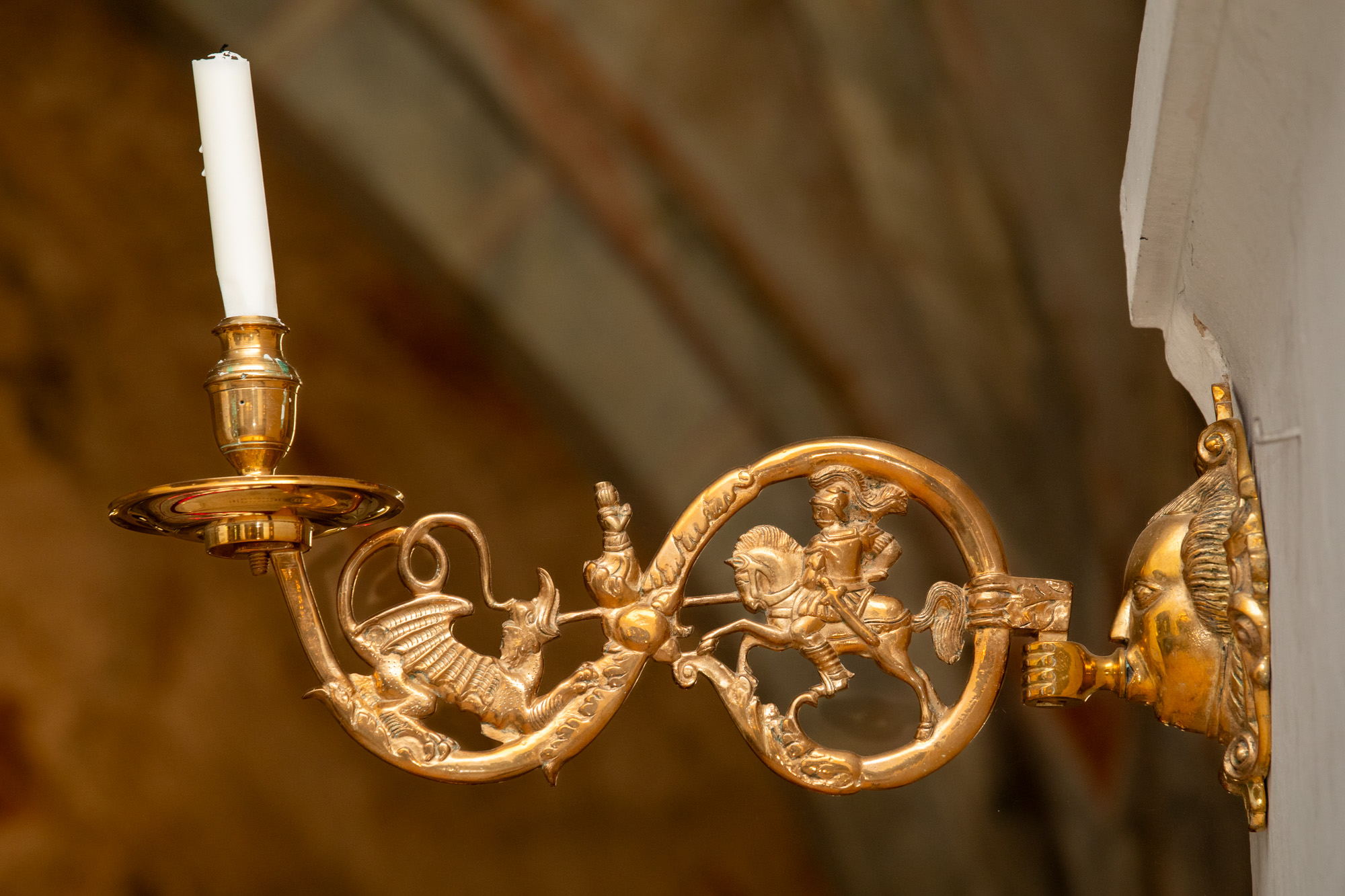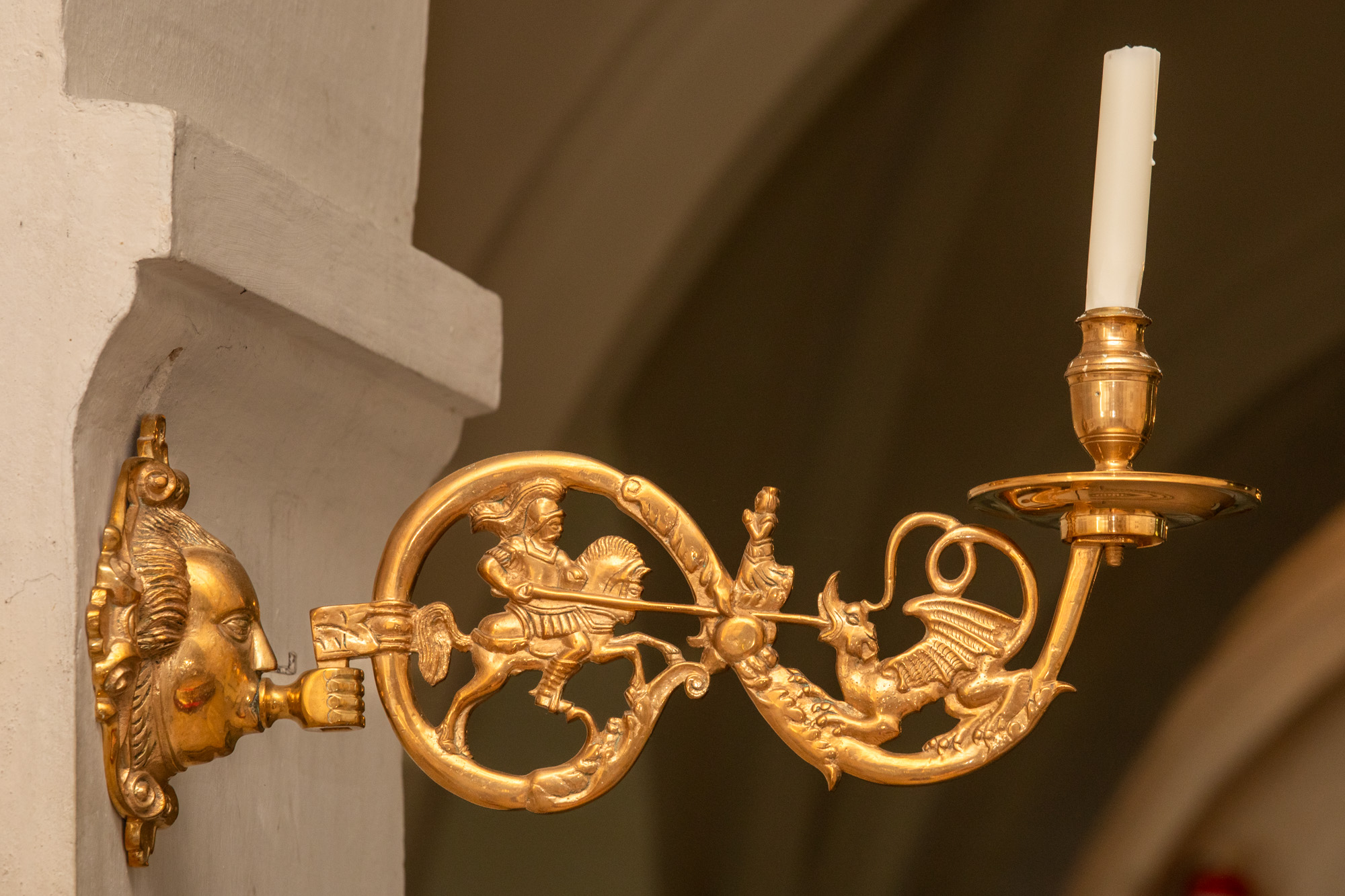 I korbuen sidder to lysearme af malm fra omkring 1600. De er skænket til kirken af grev A. Ehrensvärd. De er ens. Motivet er Skt. Jørgen, der slår dragen ihjel. På armens knudepunkt står prinsessen og ser til.