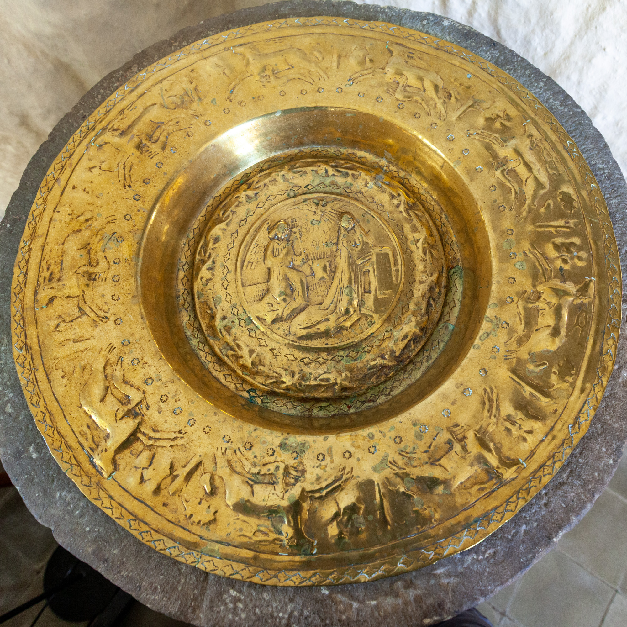 Bebudelsen i bunden. Omkring dette motiv to bladborter, og imellem dem springende hjorte. Også springende hjorte på fadets rand.