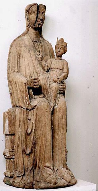 Madonna fra midten af 1200-tallet. Hun er iført kjortel med rund hals med en bred glat bort og en lang kappe med mange folder. Hun holder højre hånd frem. Der har hun haft et scepter, som nu er borte. Hendes krone er også borte. Barnet er iklædt en lang kjortel. Han sidder på hendes venstre knæ. I venstre hånd bærer han jordkloden, mens højre hånd er løftet, men halvdelen er hånden mangler. Han har stadig krone på hovedet.
