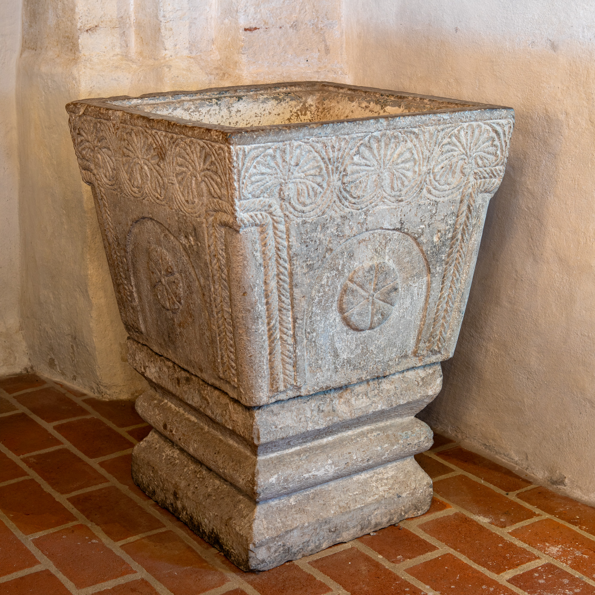 Den firsidede døbefont med dens palmettefrise øverst, rundbue med et seksdelt cirkelornament, tovstave og rundstave i hjørnerne hører til Munkerupgruppen.