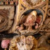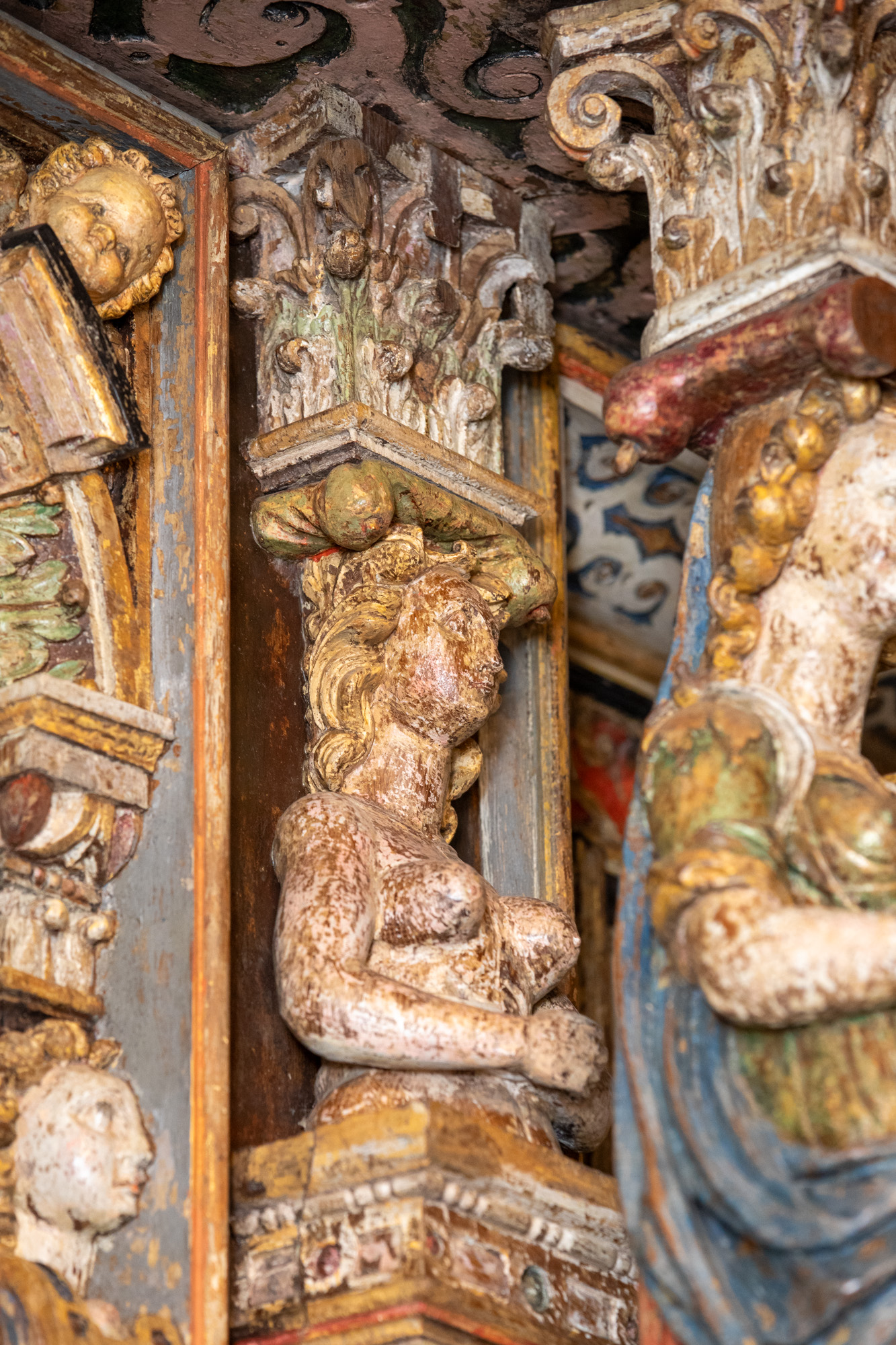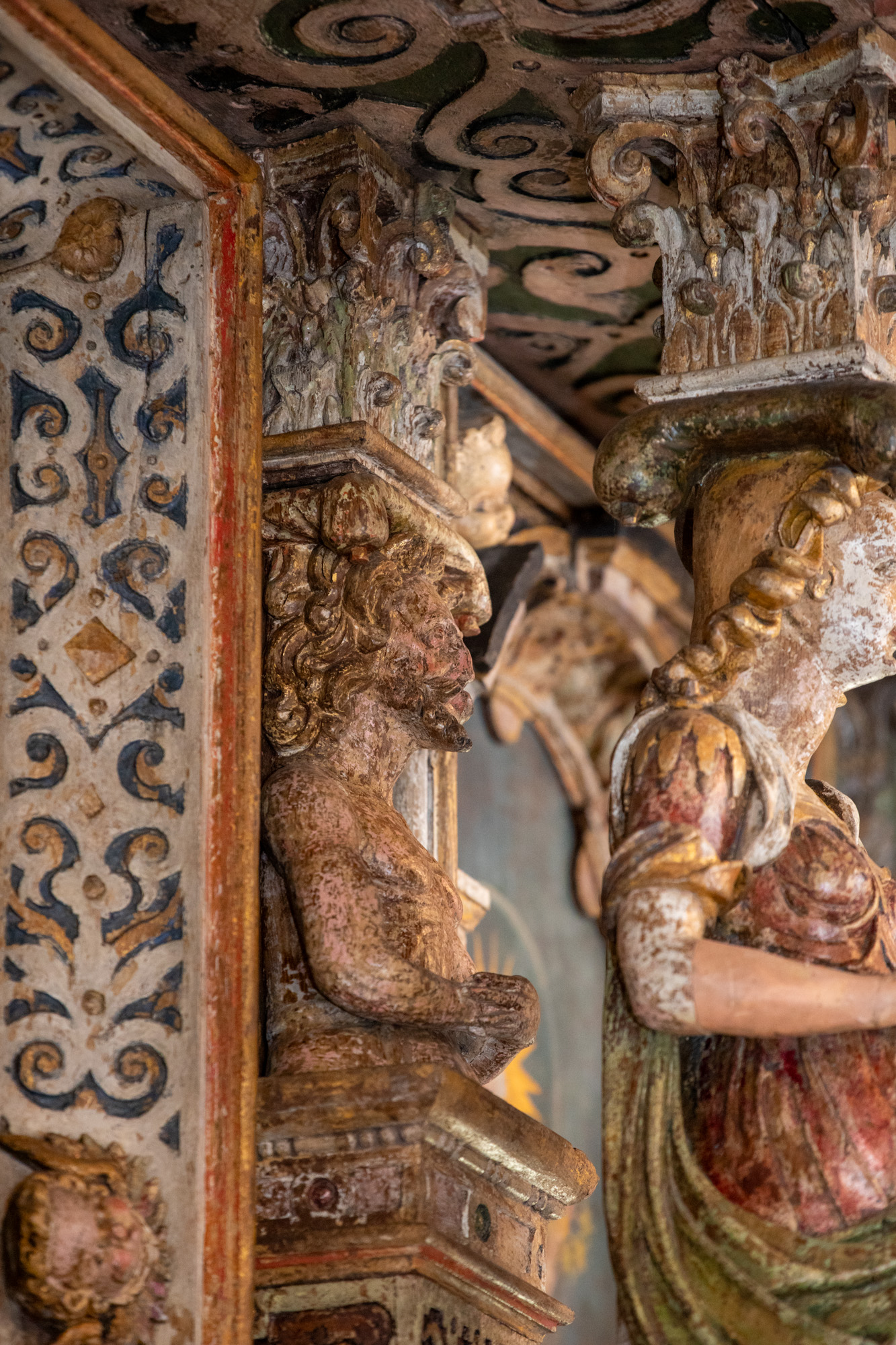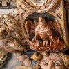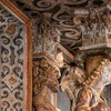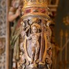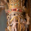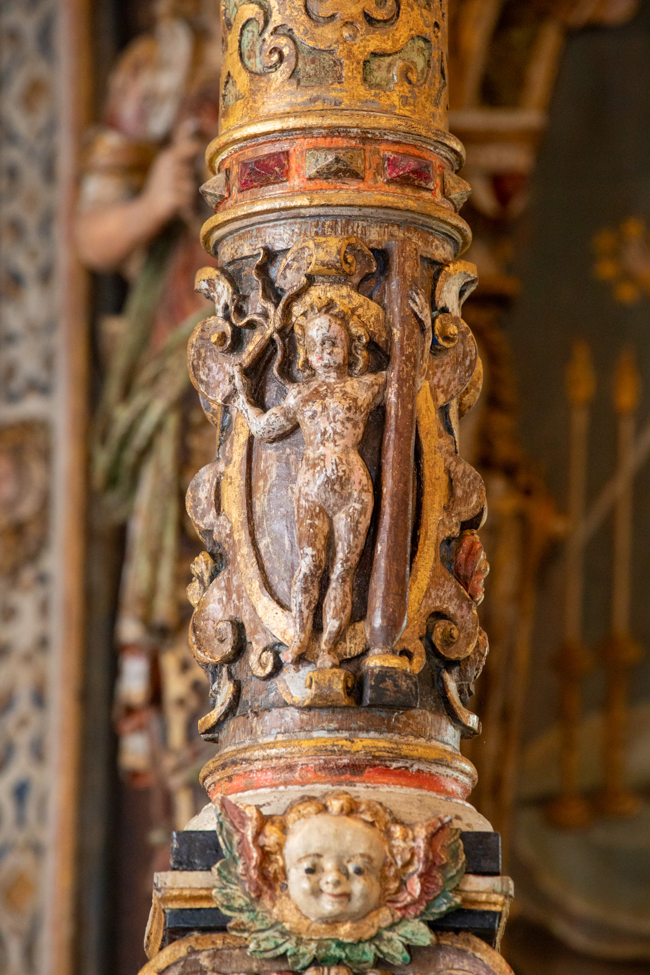 Over trekløverbuen peger en person op mod billedet ovenfor, der forestiller en engel, som måske har holdt en fakkel.
