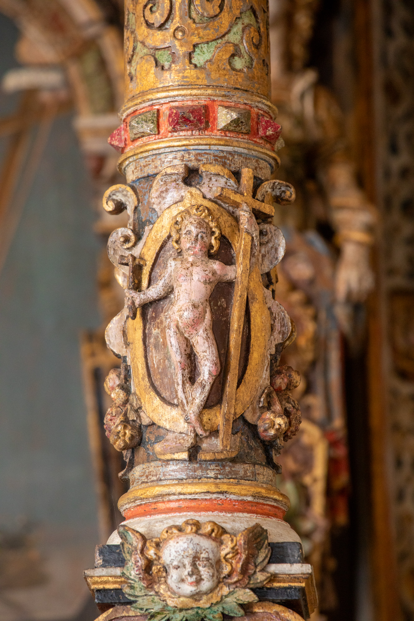 Baldakinen hviler på to søjler, der står på figurer af henholdsvis Moses og Johannes Døber. Søjlerne har korintiske kapitæler og søjleskafter, der er rigt udsmykket med beslagværk. Prydbælterne har relieffer med putti, der fremviser korset og marterpælen.