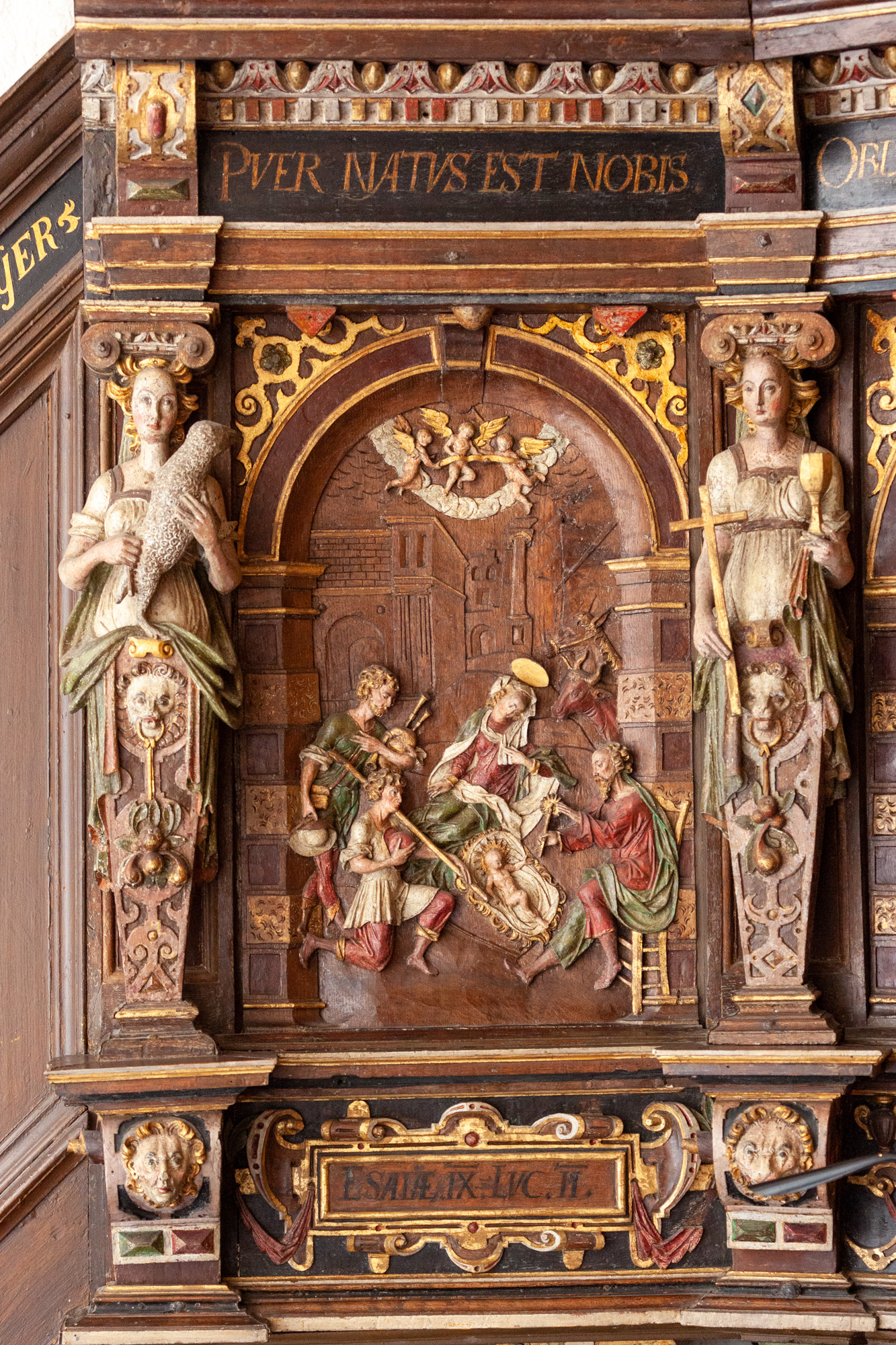 - Jesu Fødsel med hyrdernes tilbedelse. Puer natus est nobis. (Et barn er født os.) Es. 9 og Lk. 2.