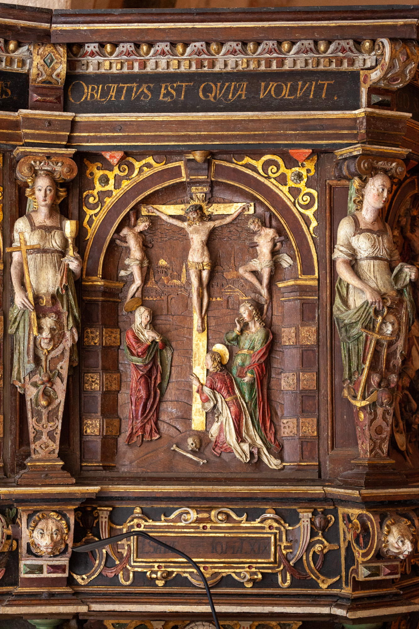 På frisen nedenunder ses teksten: ”Dn virtutum ipse / est rex gloriæ. Psal. XXIII. / Magnus Matth. Superint. et / Cano. Lund. ΤRΟXÒΣ Ὅ ΒΙΟΣ. Holger Maler.”