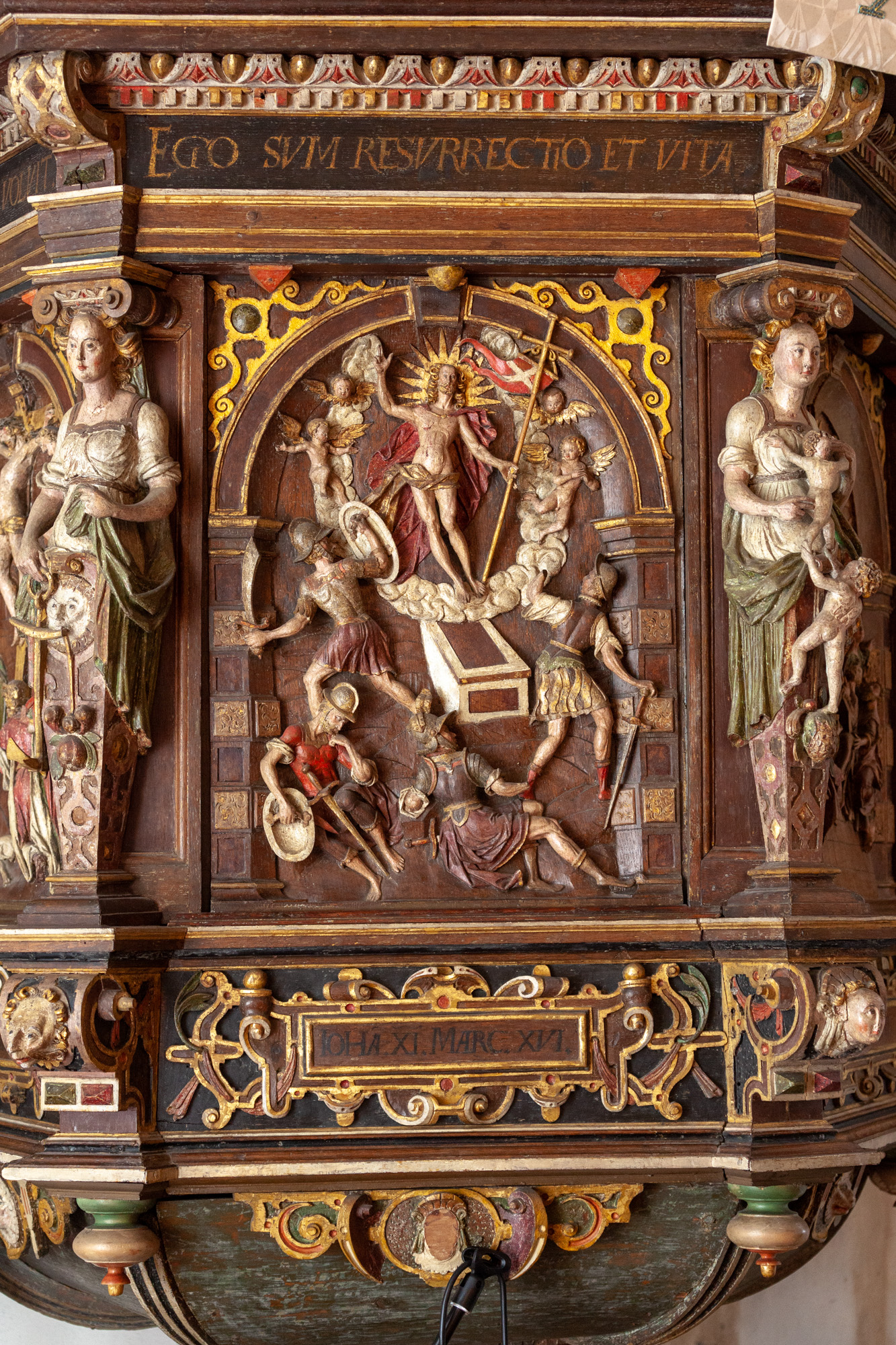 På trekanterne i niveau med baldakinen ses Markus med løven mod nord og Lukas med oksen mod syd. I trekantfelterne i begge sider er en memento mori. Matthæus og Johannes er anbragt på den øverste gesims.