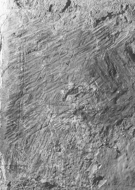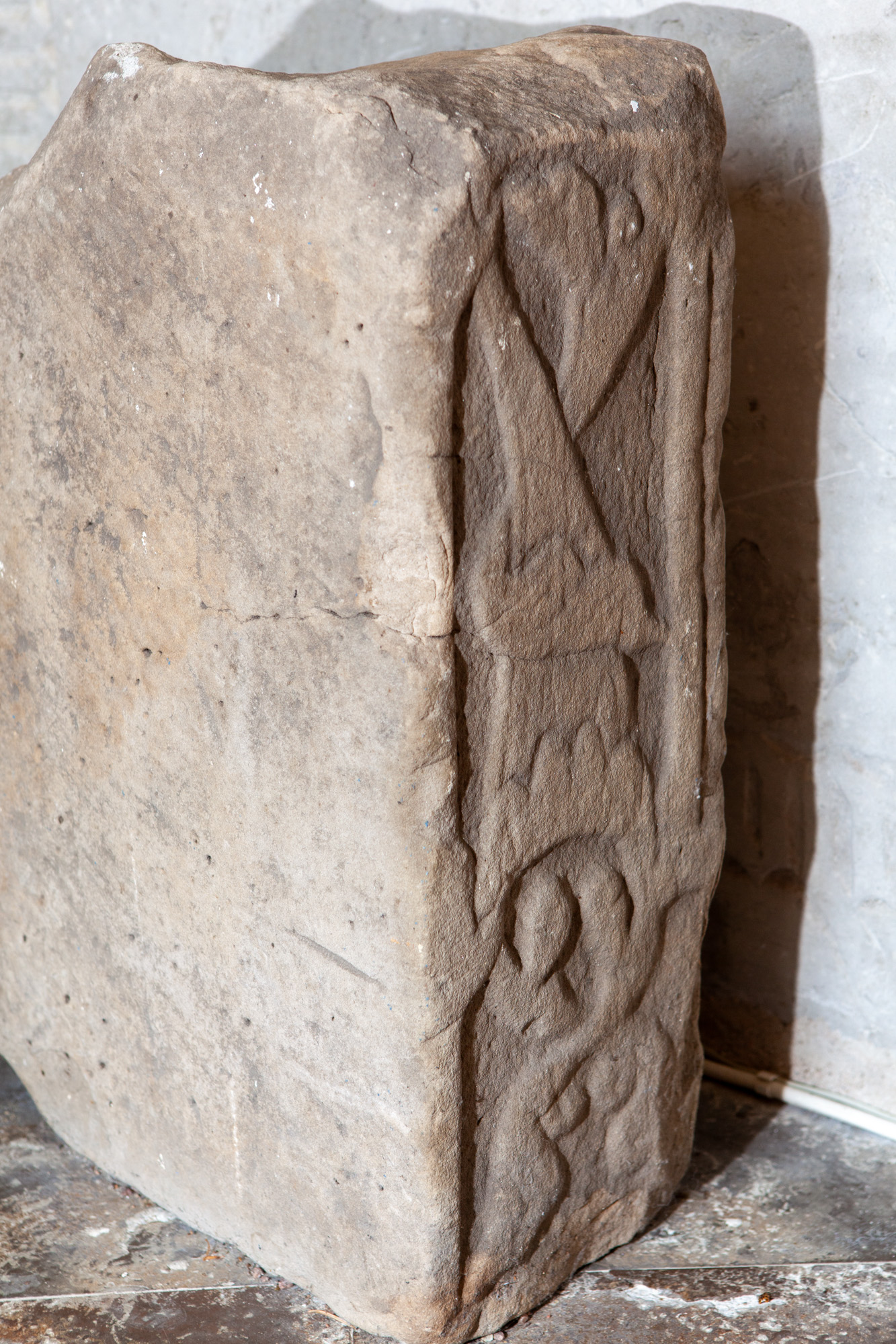 Ristning på sandstenskvader ved en vestlige indgang.
