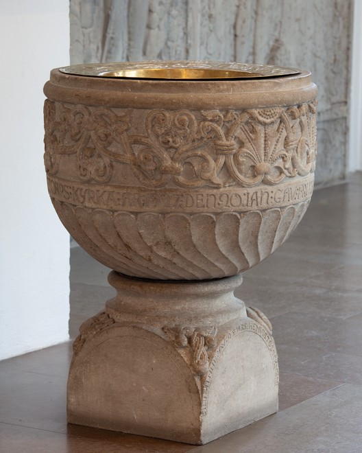 Tynell bemærker, at der mangler en middelalderlig døbefont, og gør opmærksom på, at en stenfont nævnes i en inventarieliste fra 1662. Heri hedder det også, at der er ”en Messingskiedell att hente vand udi”.