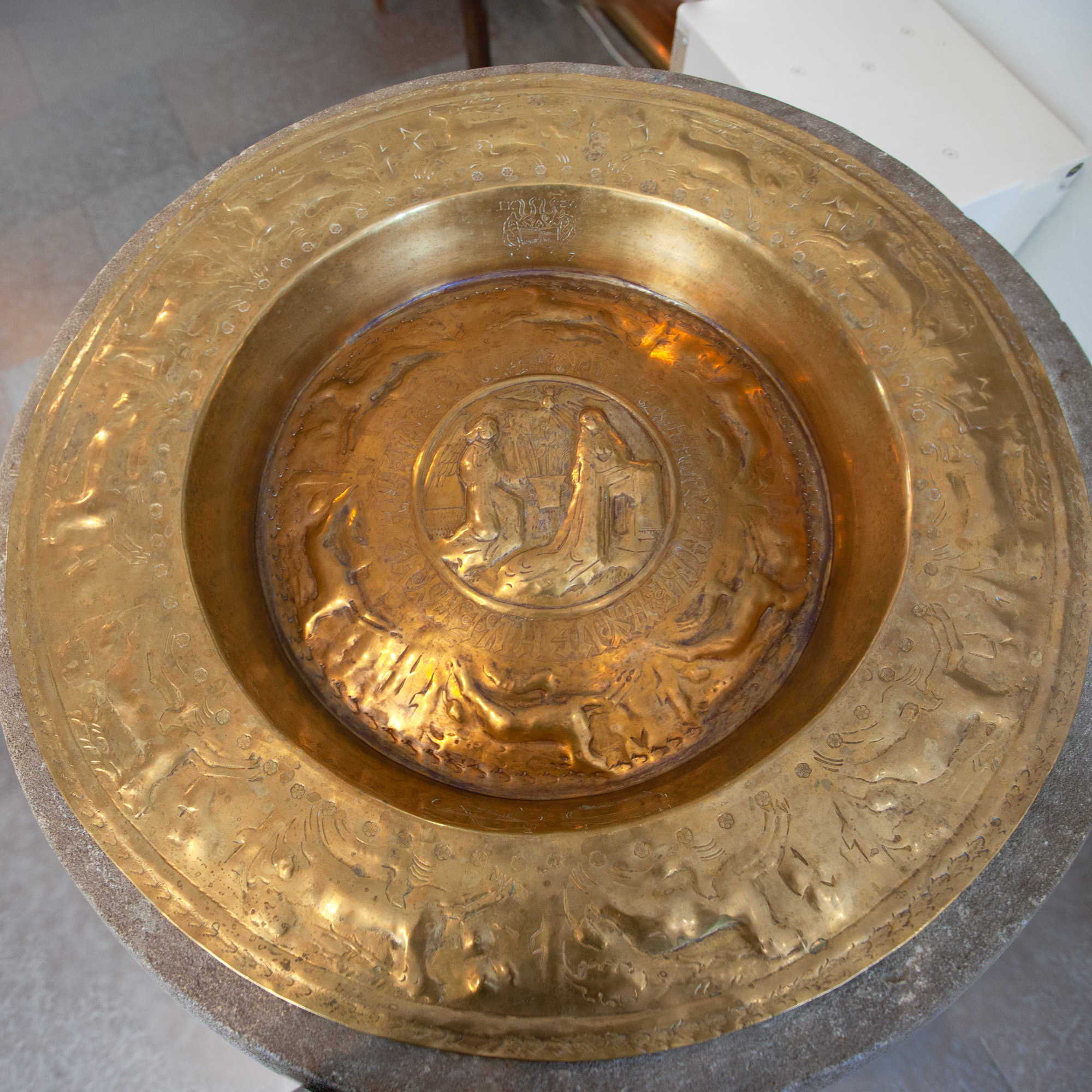 I bunden af dåbsfadet er en fremstilling af Mariæ Bebudelse omgiven af en række bogstaver, som ikke giver mening. Uden om bogstaverne er der springende hjorte ligesom på fadets rand.