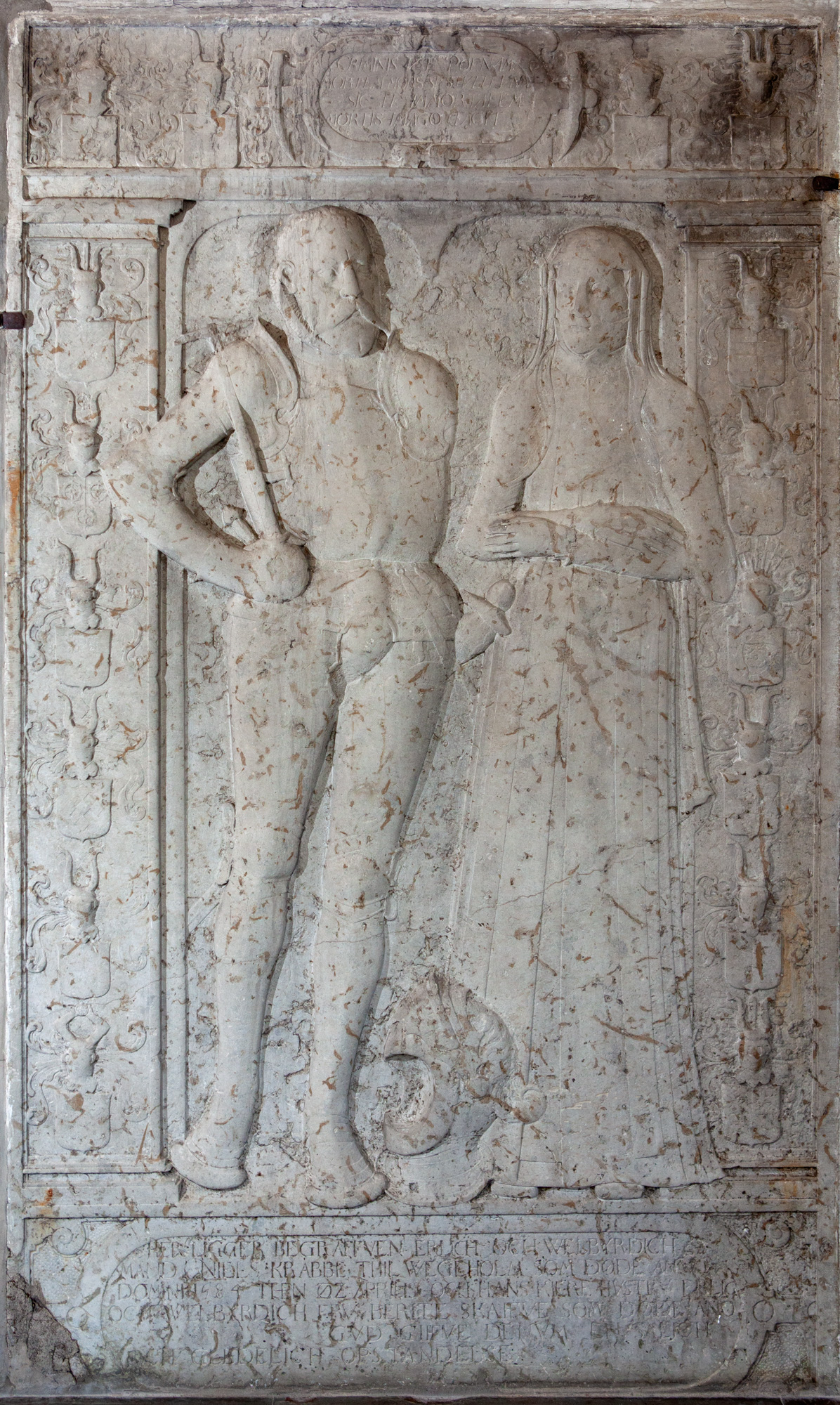 Stenen viser en kunsthistorisk overgang fra gotik til renæssance. Parret står under en gotisk kølbue, som består af to renæssancevolutter, som foroven afsluttes af to væderhoveder. Fra deres munde udgår to akantusranker mod våbenskjoldene i sviklerne. Buen hviler på pilastre, som er udsmykket med kandelabrer.