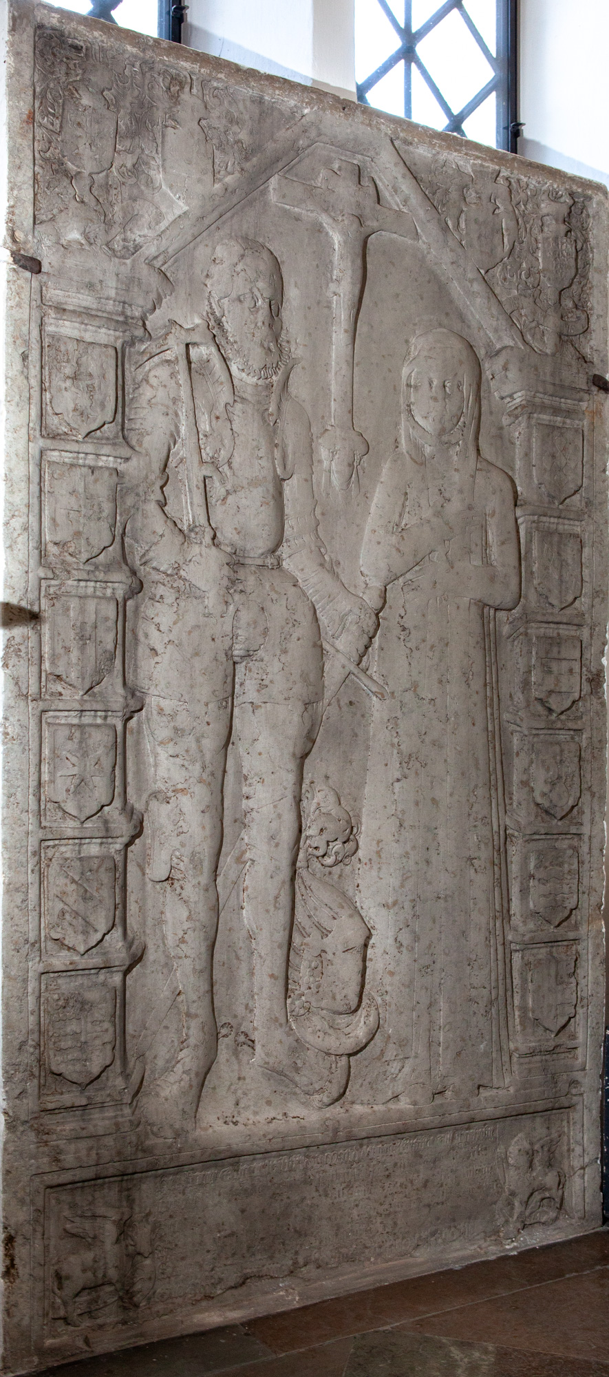 Hans hjelm ligger ved hans venstre fod, mnes han holder et sværd i venstre hånd og en stridshammer i højre. Mellem dem ses et krucifix. Buen har form af et tagspær. Ved bueansatserne er der blevet plads til de to vingede evangelistssymboler. De to firfodede ses i tekstfeltet.