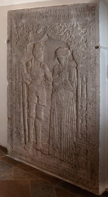 Ano 1541 Løverdag nest effter trinitatis søndag bleff under tene steen begraven erlig welby[rdi]g mand oc strenge reder her thyge krabbe tiill vegholm danmarcks rigis marsk oc hans hustru frue ane rosenkrans.