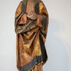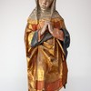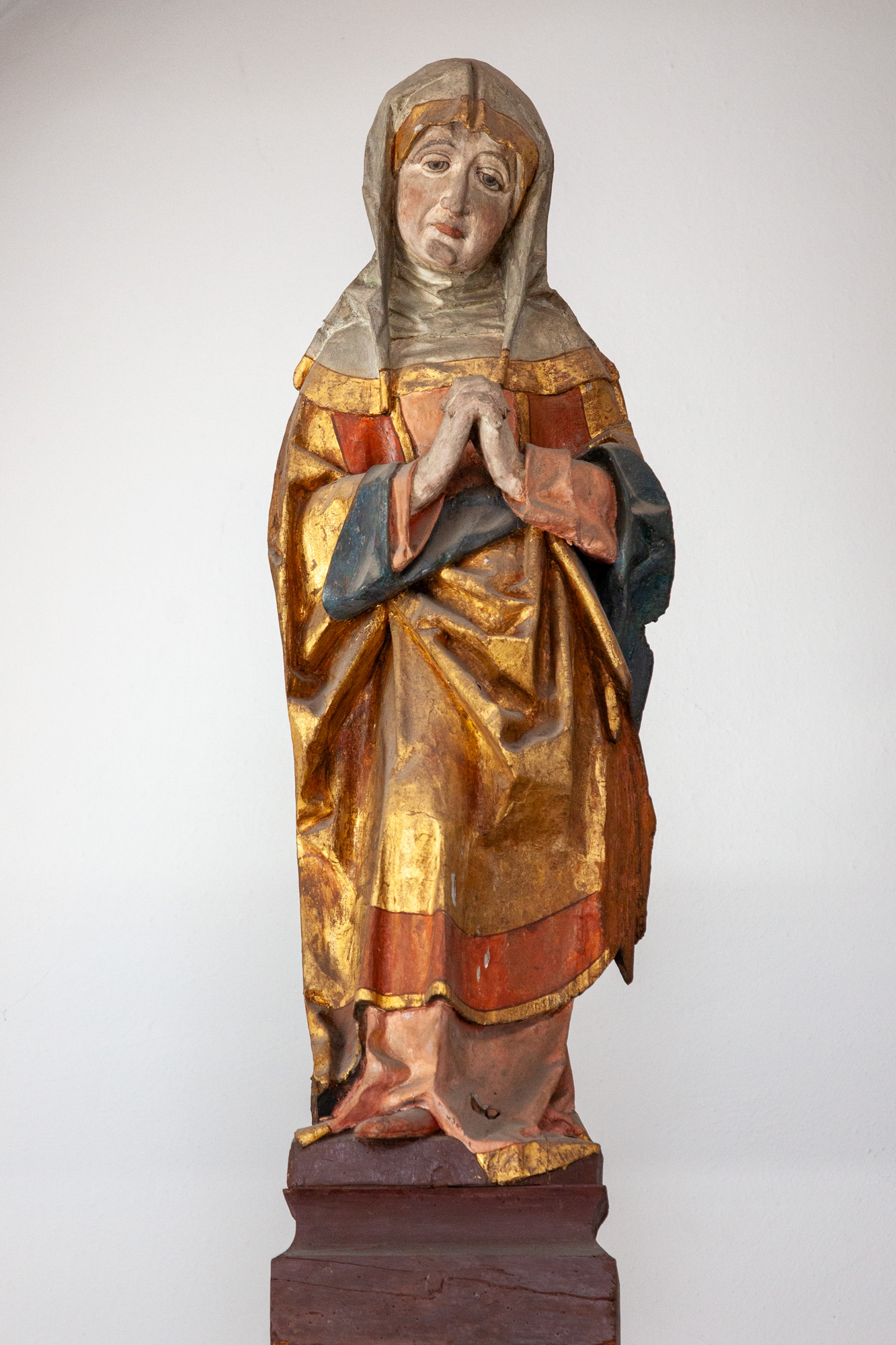 Maria står med hovedet hældende mod venstre. Hænderne er foldet foran brystet. Hun bærer hovedtørklæde.