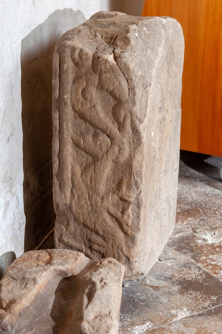 I våbenhuset står en sten med romansk ornamentik.
